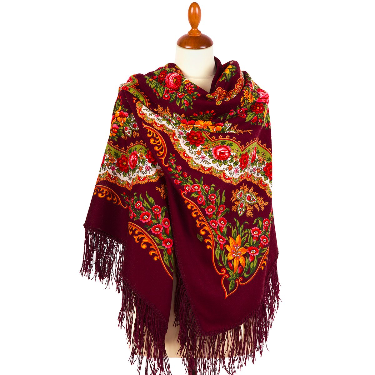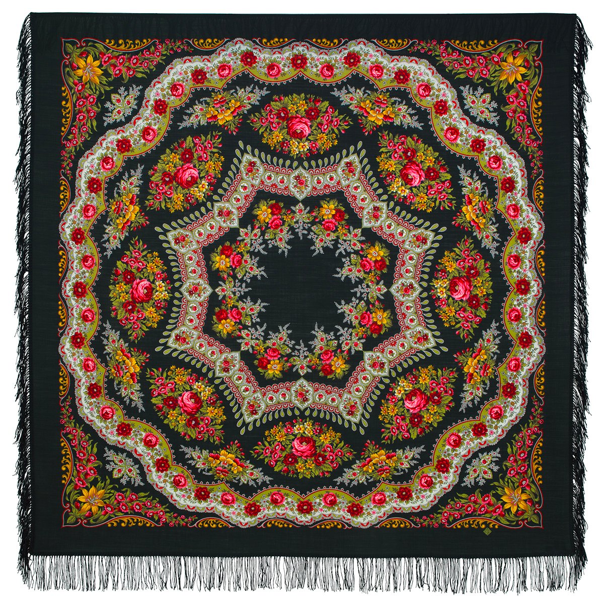 Шаль 150х150 с крупными букетами по углам и ажурным веночком из листьев каштана в среднике