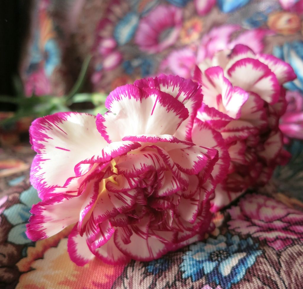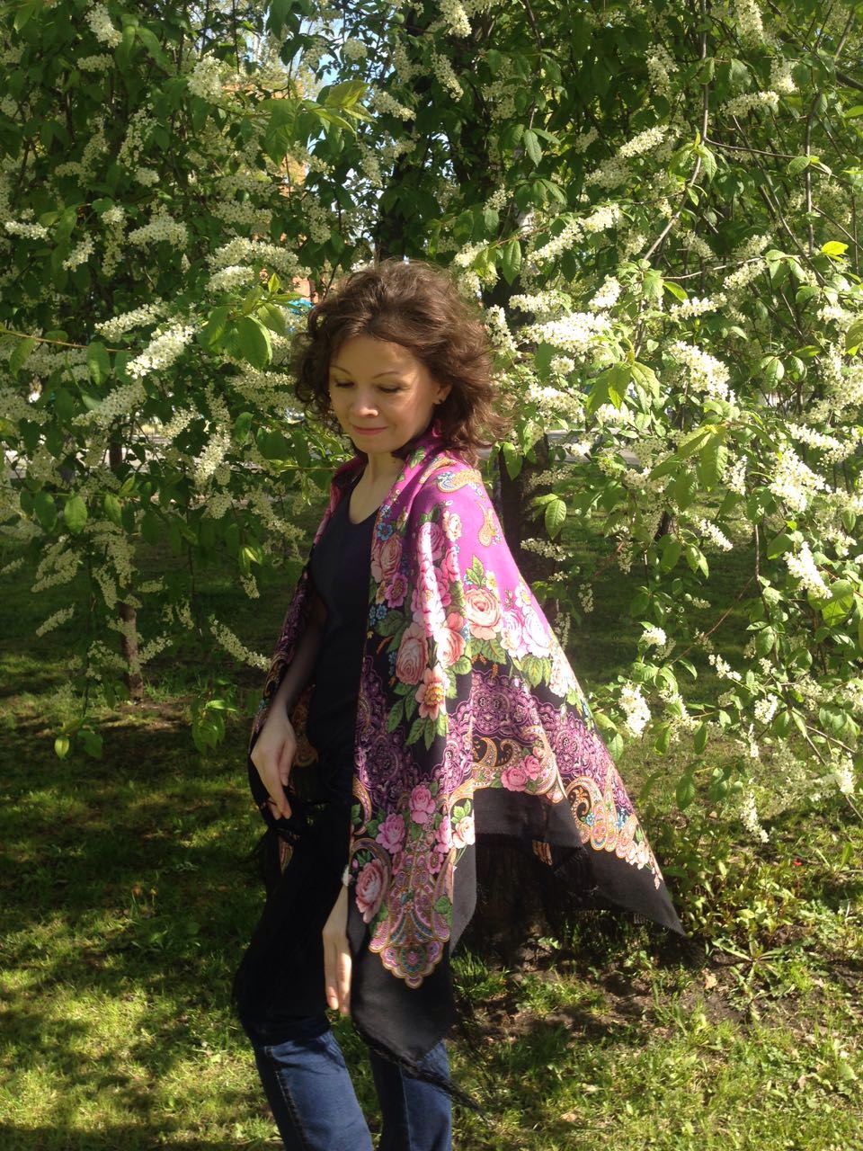 Сказка на ночь 1573-18 , яркий, веселый, сиреневый платок (хотя возможно, больше к оттенку фуксии уходит этот сиреневый цвет). Розы прописаны очень нежно, сиреневое кружево по краю платка, и чтобы совсем не уйти в приторную сладость, кайма строгого чёрного цвета ( очень удобно на тот случай, если основной цвет одежды-черный)