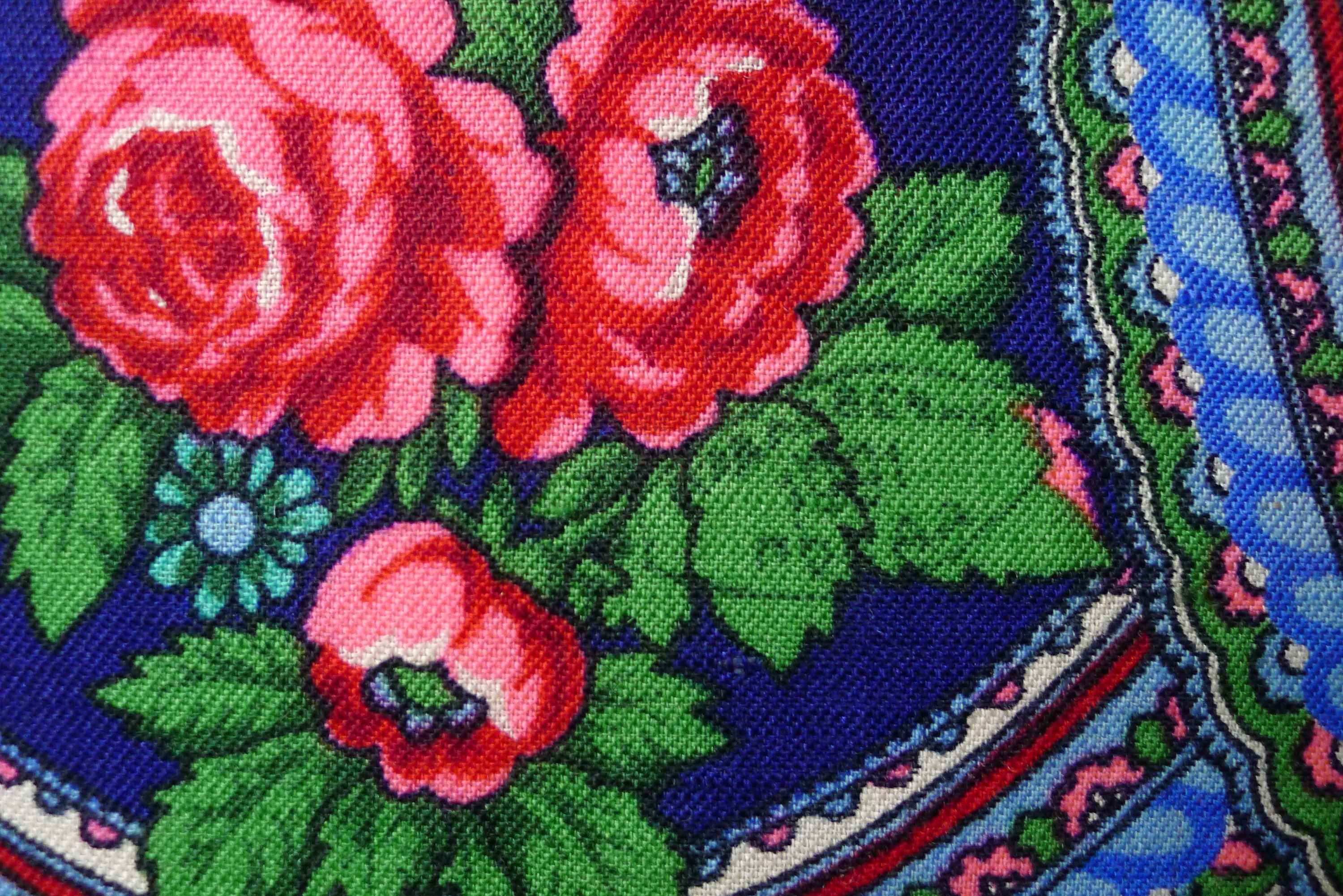 Платок активно ношен, стиран не раз, но краски яркие, причем изнанка почти не отличима от лица, такая же яркая. Сейчас размер 85х88-89.