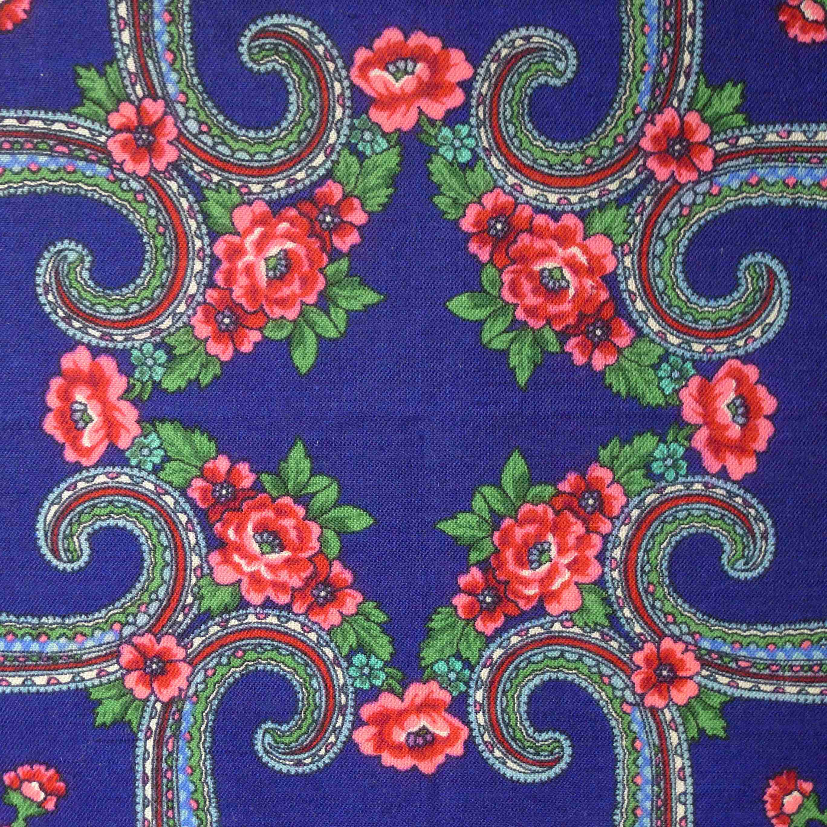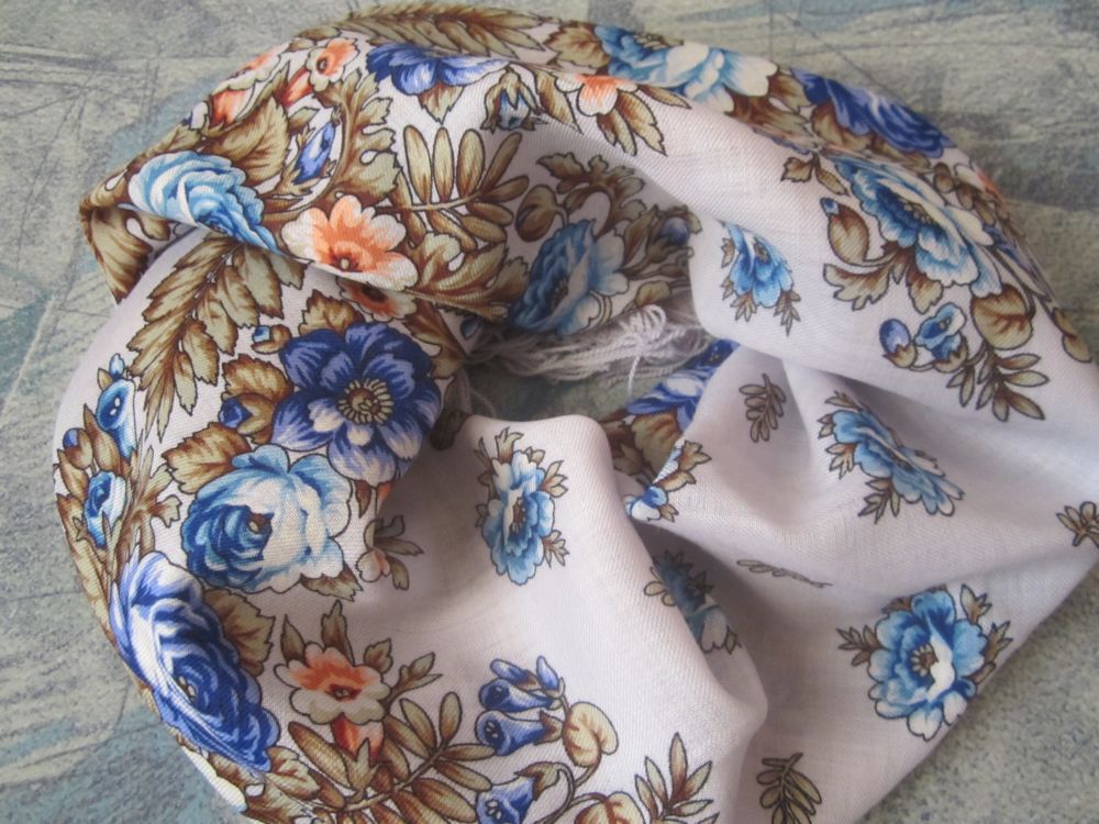Платок активно ношен, стиран не раз, но краски яркие, причем изнанка почти не отличима от лица, такая же яркая. Сейчас размер 85х88-89.