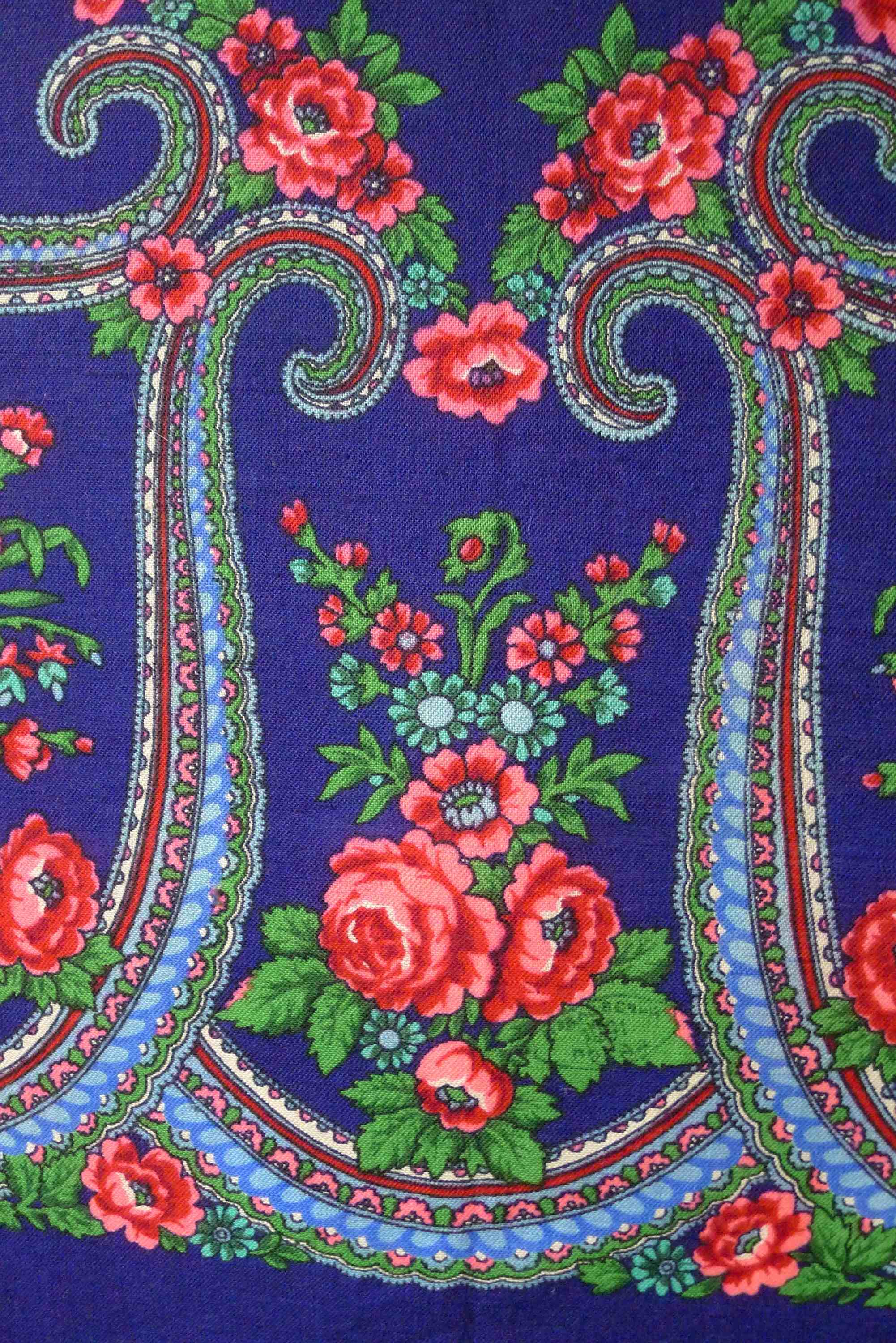 Платок активно ношен, стиран не раз, но краски яркие, причем изнанка почти не отличима от лица, такая же яркая. Сейчас размер 85х88-89.