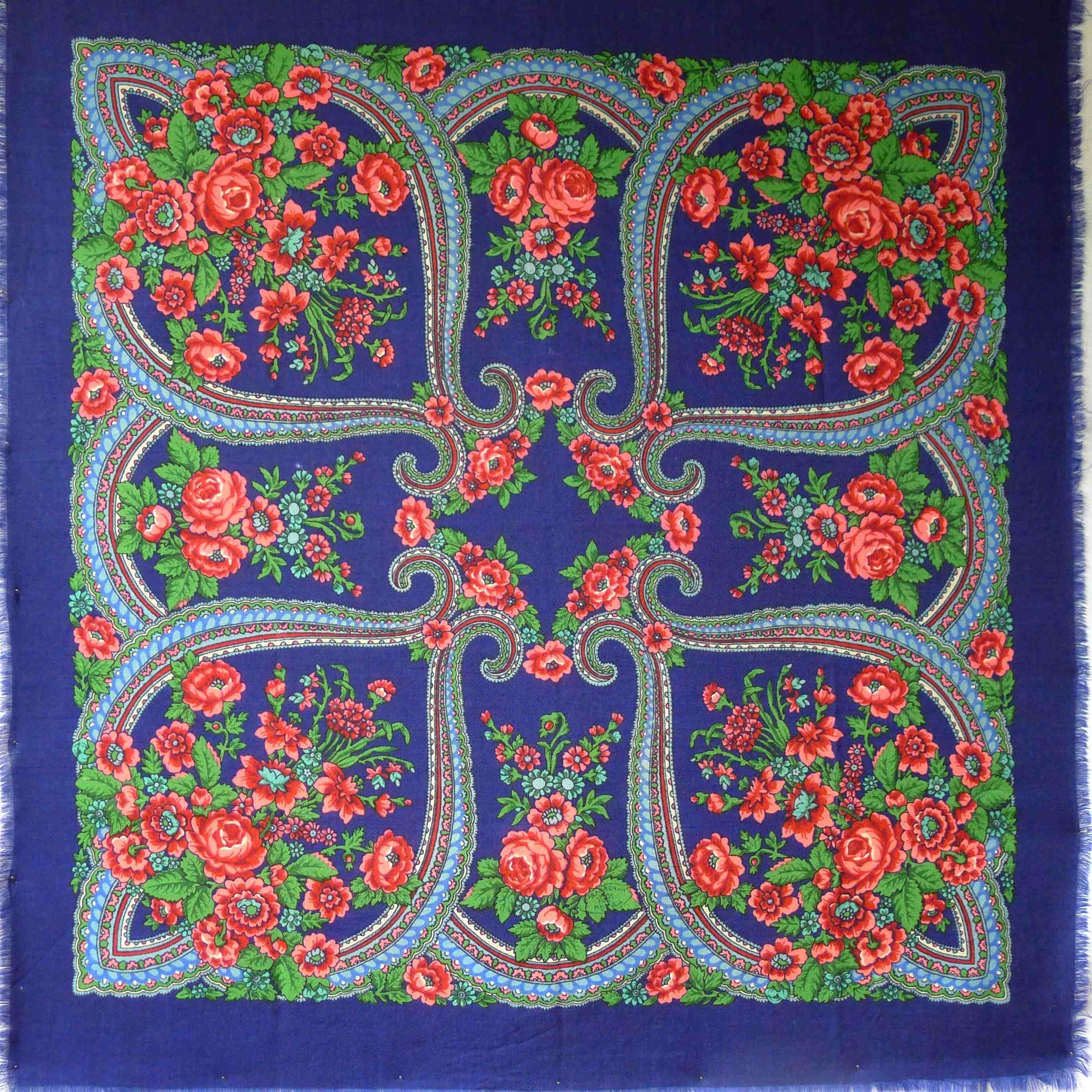 Платок активно ношен, стиран не раз, но краски яркие, причем изнанка почти не отличима от лица, такая же яркая. Сейчас размер 85х88-89.