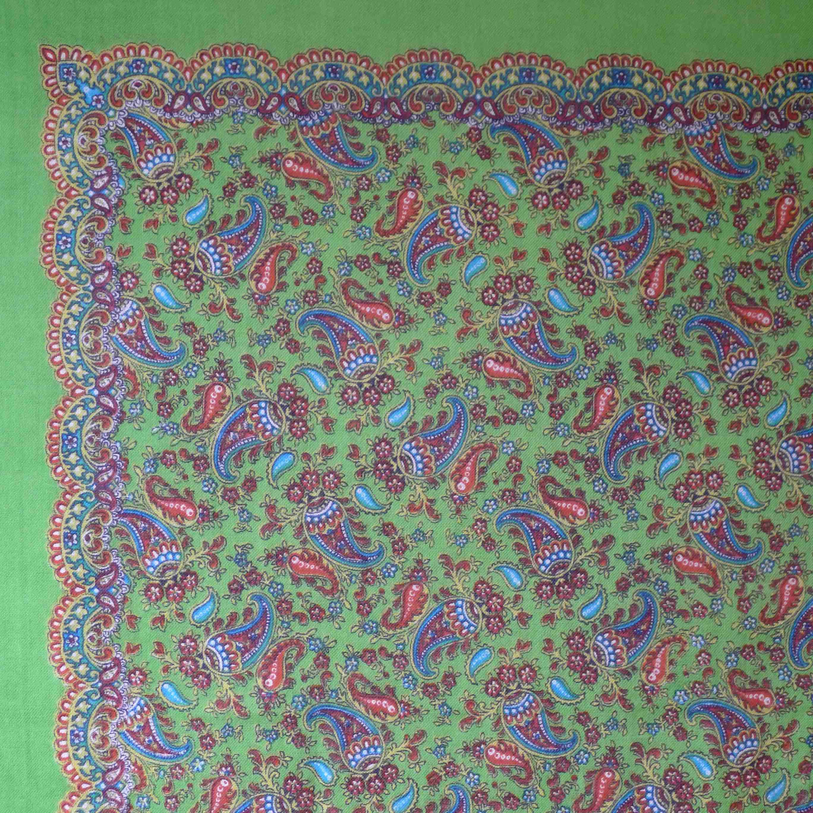 Платок активно ношен, стиран не раз, но краски яркие, причем изнанка почти не отличима от лица, такая же яркая. Сейчас размер 85х88-89.