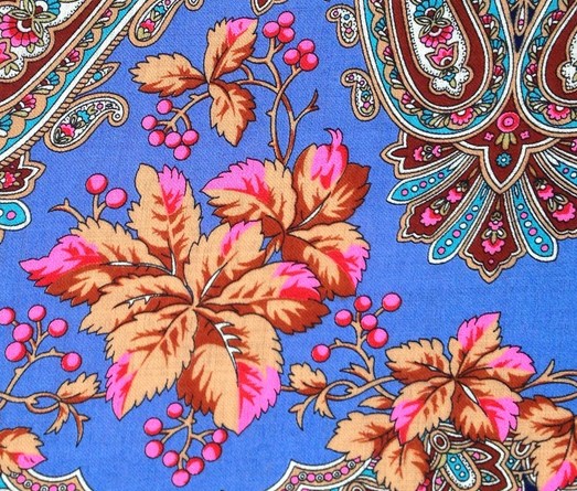 Орнаментально-декоративная часть образована узорной рамкой из узнаваемых стилизованных павловских листочков и простеньким, но, в то же время, витиеватым ожерельем с удлинёнными "огурцами". Рамка украшена по внешней части квадрата живыми листиками, частично повторяющими базовый элемент. Всё вместе звучит подлинно и чисто. В павловопосадском стиле ;)
