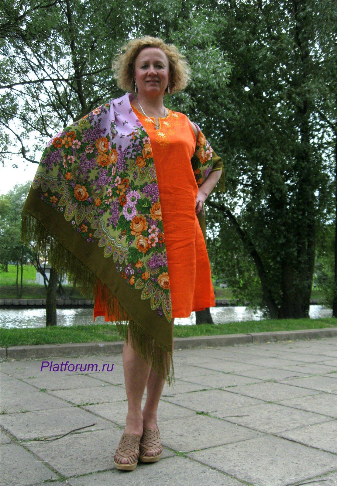 Мне как раз больше всего из примерок в архиве эта шаль понравилась именно с оранжевым. У Каффы много фото в этом платочке и разных цветовых сочетаний. Но с оранжевым платьем наиболее выигрышно показан платок, на мой взгляд.