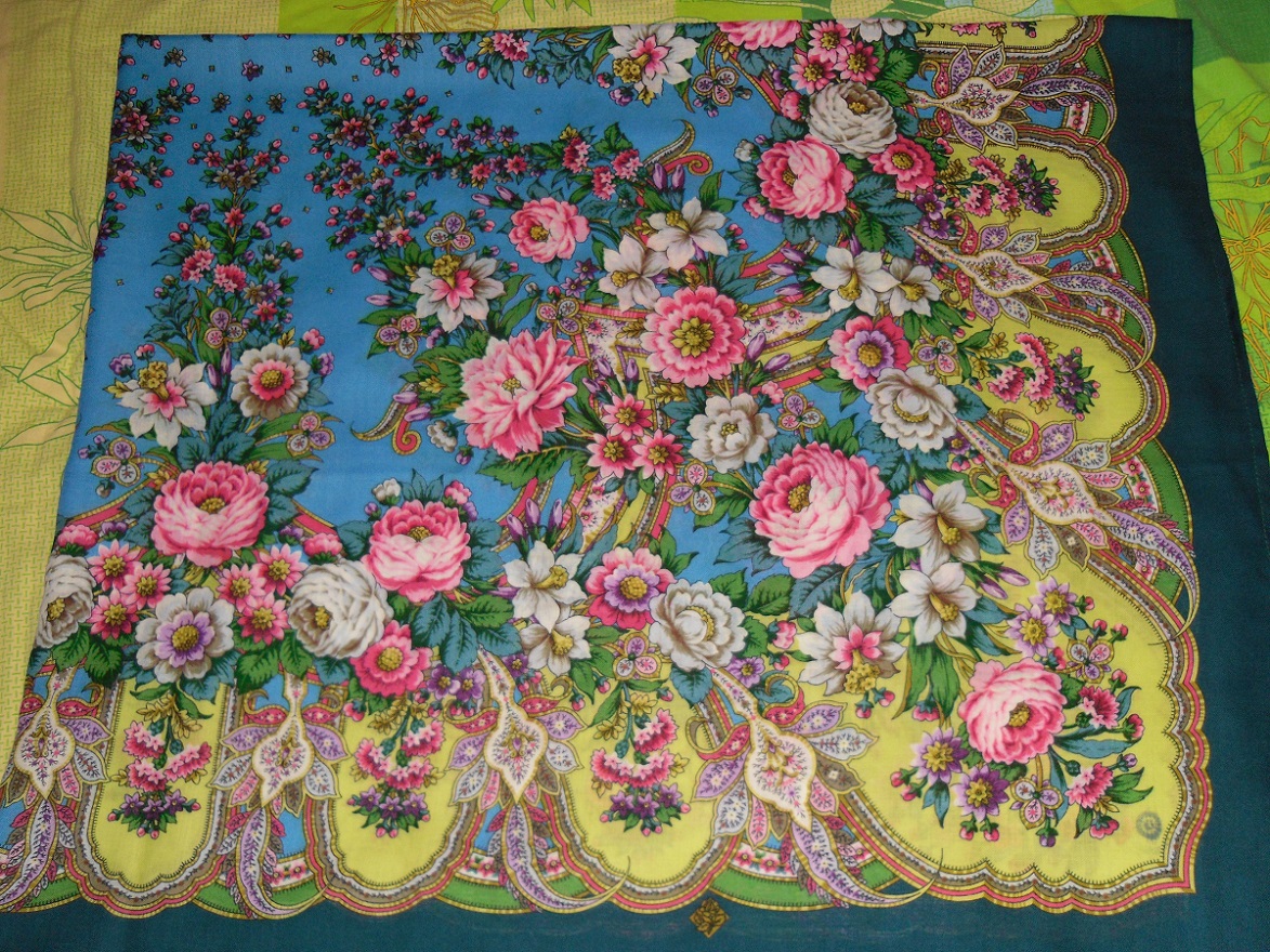 Бегала в магазин ППМ во время обеденного перерыва, посмотреть платочки. Буквально влюбилась в Лукоморье 9 , но смутили меня его желтенькие медальончики (если честно очень красивый желтый цвет, мне нравится, но мне говорят что не идет такой) и зеленая бахрома тоже не на мой вкус, а вот все остальное: голубой фон, цветочки все просто прелесть, когда прикинула на себя словно в сказку попала. В тот день я ушла с другим платком... но лукоморье не давало покоя, в итоге взяла в лоскуте чтоб не накладно и посмотреть получше как он мне покрутить его(Кликните, чтобы почитать, что спрятано под катом)... теперь все-таки хочу купить 1 сорт потому что с бахромой мне платочки нравятся больше, а лоскут пойдет на зиму под шубку
