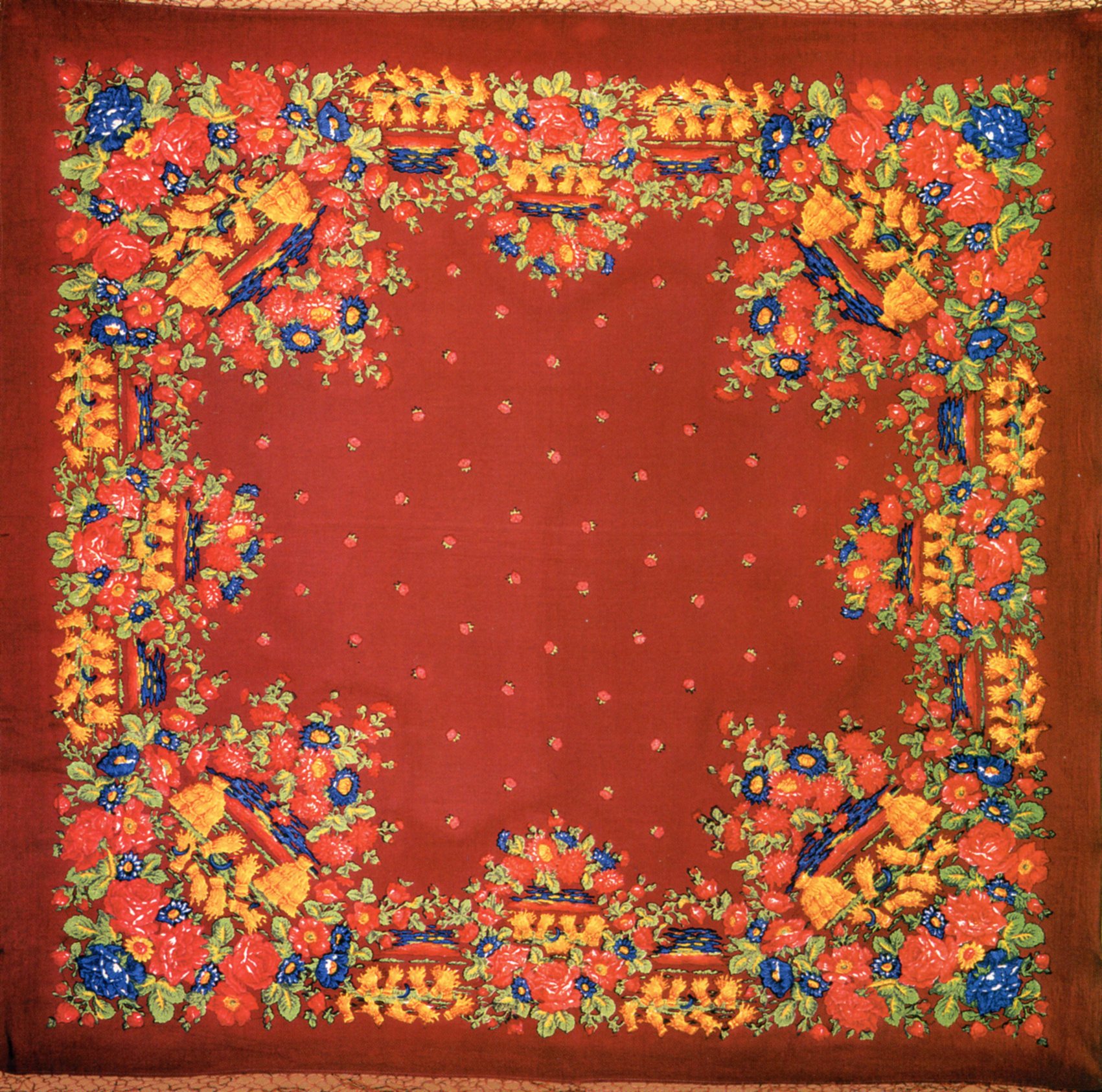 Шаль 155х155 хлопчатобумажная с цветочной каймой и радужными "спиральками". Ручная набойка. 1930 гг.