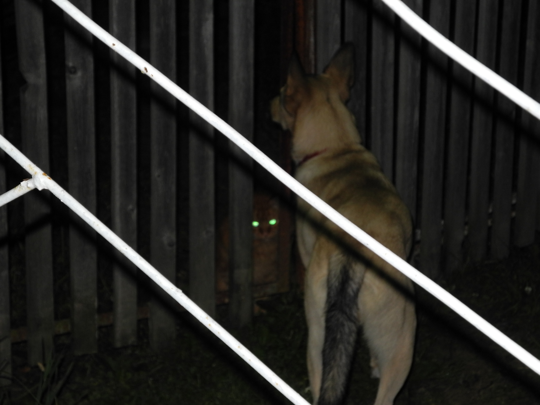 А это мы собираемся гулять - я уже за решеткой общей калитки дачного товарищества, собака ждет кота, а тот вечно тормозит всех...