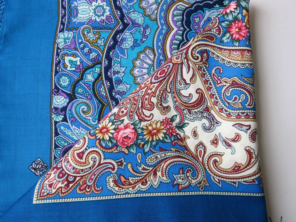 "Ласковое солнце" смотрится темно-синим,бисерным, "Королева красоты" ярче из за более крупного рисунка и больших по размеру фрагментов с белым и бирюзовым цветом- очень яркий, красивый по цвету (для любителей синего и его оттенков ) платок.