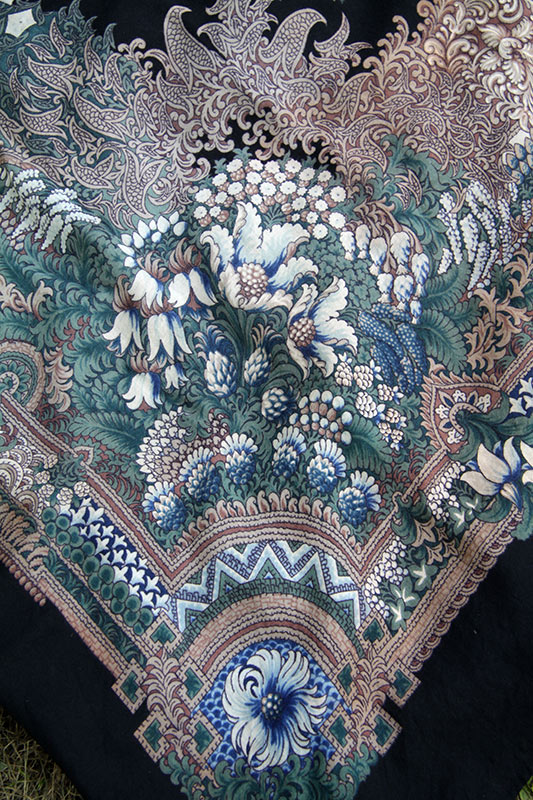 Платочек старенький, предполагаю, что стиран и краски должны быть ярче, хотя, кто знает, нового не видела. На всякий случай вводим поправку на яркость красок.