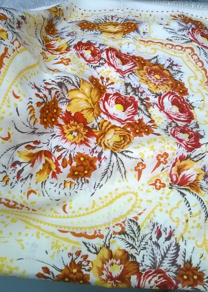 Добрый вечер всем. Я на форуме новенькая,но свою небольшую коллекцию шалей и платочков имею. Хочу сделать свой вклад в эту тему.Недавно приобрела непрокрашенную шаль Миндаль 0. Показалась мне очень интересной. Белопольная р-р 150х150. Цветов всего три-коричневый, красный и на краях листочков немного хаки. Издалека рисунок кажется серым, но на самом деле это просто черный контур, как бы нарисованный тонкой гелевой ручкой. Рисунок четкий, я бы сказала-чеканный. Ткань плотная, пластичная.