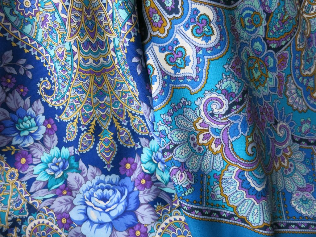 "Ласковое солнце" смотрится темно-синим,бисерным, "Королева красоты" ярче из за более крупного рисунка и больших по размеру фрагментов с белым и бирюзовым цветом- очень яркий, красивый по цвету (для любителей синего и его оттенков ) платок.