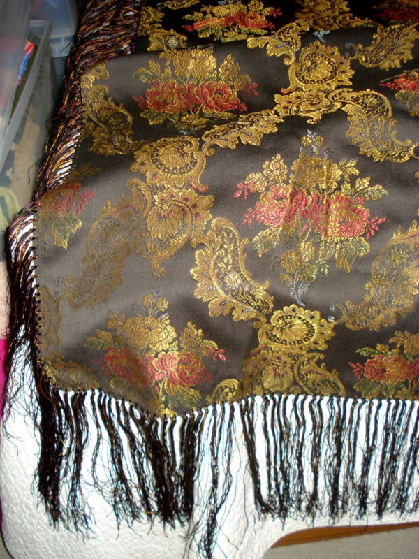 Веселенькая скатерка! На самом деле, я часто вижу в интернете шали, которые из-за гигантских размеров довольно трудно отличить от скатертей (и наоборот). Особенно это относится к вышитому шелку и жаккардовым вещицам... Думаю (судя по дефектам), иногда их так и использовали, на столах.