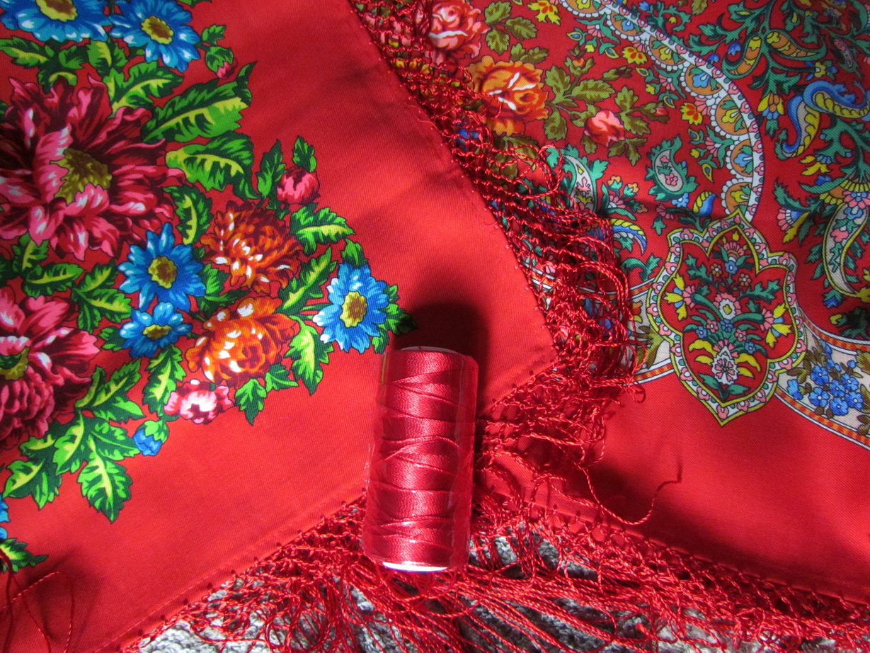 У меня Медальоны насыщенного алого цвета, может быть поэтому нитки подошли. Видела эту шаль в сувенирном магазине, даже не признала сразу...кораллово-алая, бахрома смотрелась красной на фоне каймы, совершенно не понравился такой вариант Медальонов.