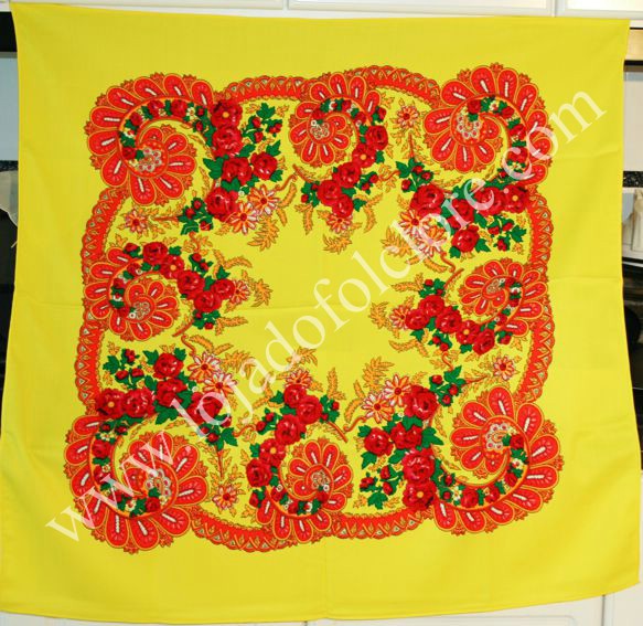 Перевелось типа «Платок на голову (целиком), twill, квадрат, фон красный, с узорами из геометрических, цветочных и растительных мотивов в оранжевом и синем цветах. Костюм Domingar. Музей Костюма Виана-ду-Каштелу; 2007»