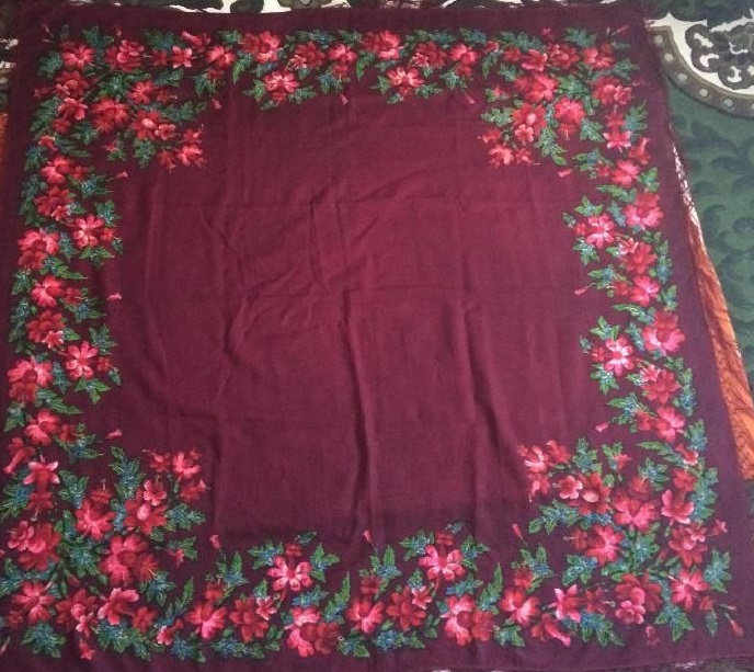 Платок ручной набойки, 128 х 132 см. Ткань, судя по всему, смесовая - шерсть+хлопок. Достался мне со срезанной бахромой