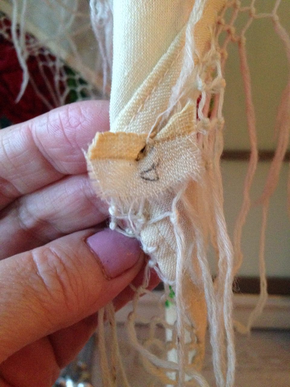 Шаль (платок) 145х145 с пышными букетами с колокольчиками_МППО: вшитая бирка с номером бахромщицы