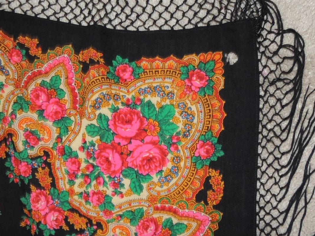 Размер - 1 метр плюс бахрома. Продавец считает, что платок приблизительно 1940х годов, но, может быть, и более ранним или более поздним. Тем не менее, по ее мнению [а она продает старинные шали и платки), платок очень старый.