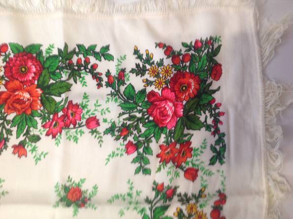 Размер - 1 метр плюс бахрома. Продавец считает, что платок приблизительно 1940х годов, но, может быть, и более ранним или более поздним. Тем не менее, по ее мнению [а она продает старинные шали и платки), платок очень старый.