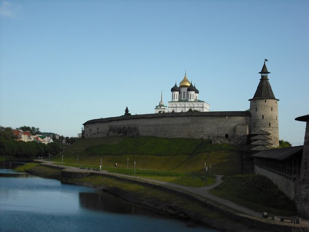 Кремль или Кром(от слова окормлять,то есть защищать) расположен на мысу при слиянии двух рек-Псковы (маленькой) и Великой (большой)В 8-10 веках строятся деревянные стены Кремля,в 10-13 веках строятся каменные укрепления,после чего начинаестя строительство башен Кремля,усиление крепостых стен и наращивание их в высоту.В Кремле собиралось народное вече,хранилось продовольствие,стояли клети,которые охраняли сторожевые собаки,их называли "кромскими псами".На территории Кремля находится Троицкий собор-главный храм Псковской земли и Пскова.