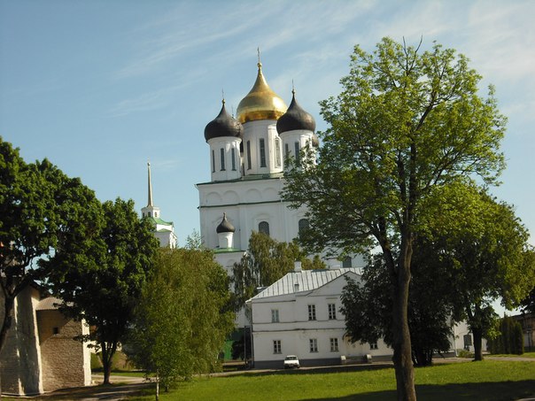 Свято-Троицкий Кафедральный Собор-символ земли псковской. В 13 веке псковский князь Довмонт призывал:"Братья мужи,псковичи!Потягните за Святую Троицу,за свое Отечество".Основание собора приписывают равноапостольной княгине Ольге. Около стен собора на площади собиралось вече,в архиве хранились важнейшие документы,в усыпальнице собора покоятся Святые и Архиереи Псковской земли.Нынешний собор является четвертым по счету,построен в 1699 году,а в 1935 был закрыт,в нем был антирелигиозный музей. Интересно, что во времена немцкой оккупации 1941-1944 годах собор снова был открыт и уже не закрывался. Собор-самое высокое здание Пскова и доминирует в архитектуре города,в ясную погоду главы собора видны за несколько километров от города.