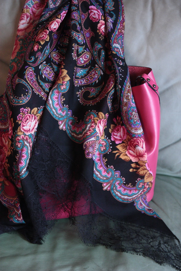 Покажу шедевральную косынку с кружевом от Елены Философ. Тонкая однако работа! И очень удобно. Косынка получается совсем тонкая и компактная. К тому же очень изящная. Этакий рояль в кустах - легким движением фокусника вынул из сумочки, и уже не просто гражданка в платке, а настоящая испанская "Маха на балконе".