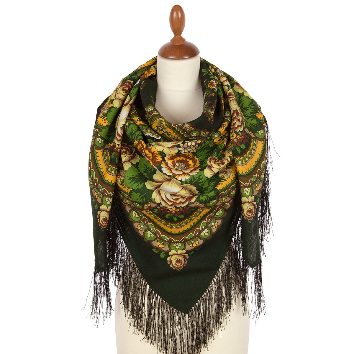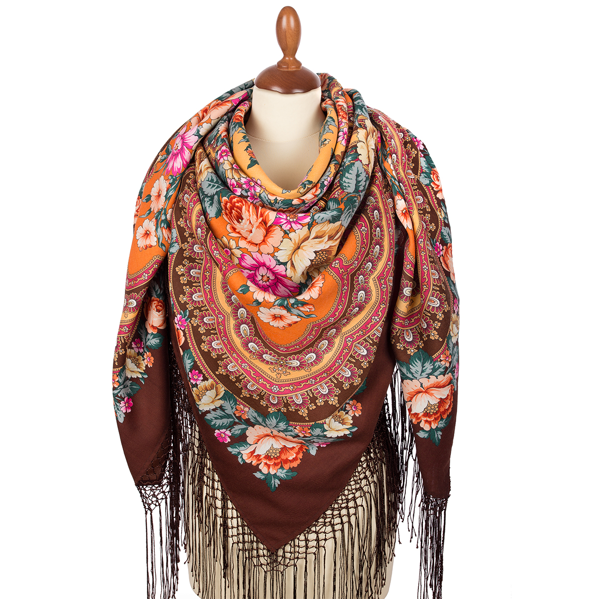 Платок из уплотненной шерстяной ткани с шелковой бахромой, 148х148 см. Новый вид давно ушедшего из ассортимента платка. Напечатан 17 красками. Выпуск 2019 г.