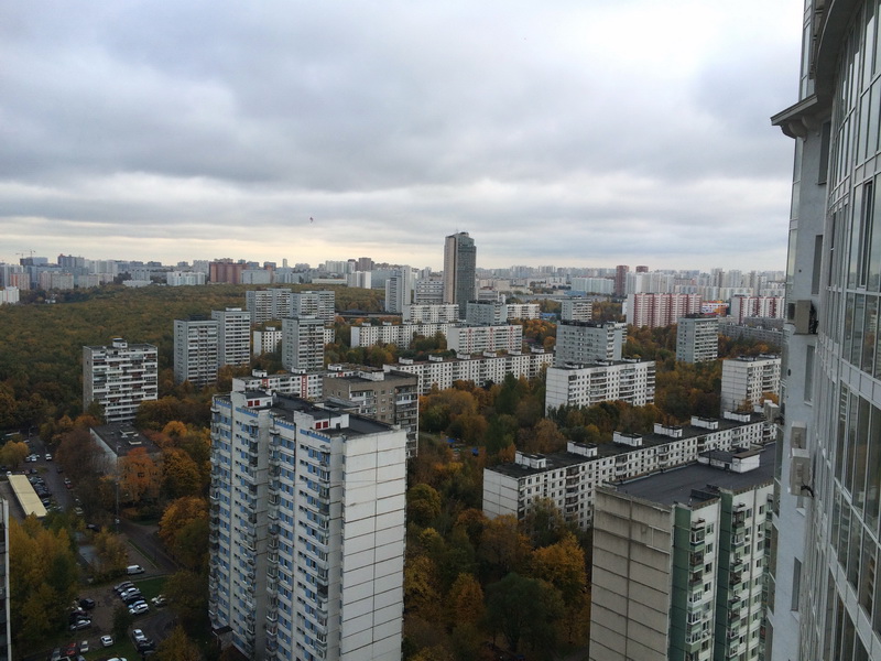 Балконы совсем открытые, и там просто сдувает с ног. Смотреть вниз довольно страшно. Но Москва очень хороша, даже в такую осеннюю погоду.