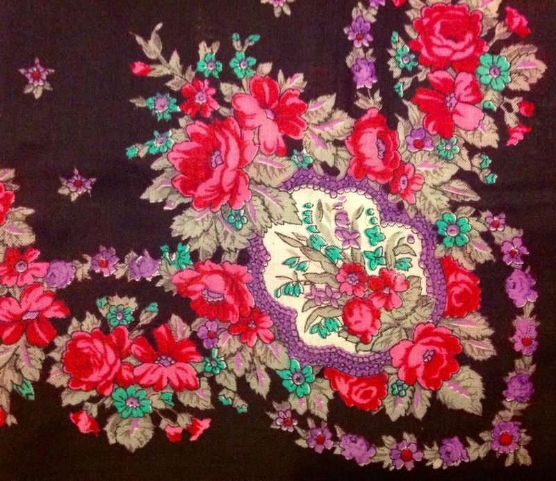 Колорит мне напимнил колорит платка из музея в Сергиевом Посаде (прототип Подмосковных вечеров). Та же бирюза и сирень на темно-бордовом фоне.