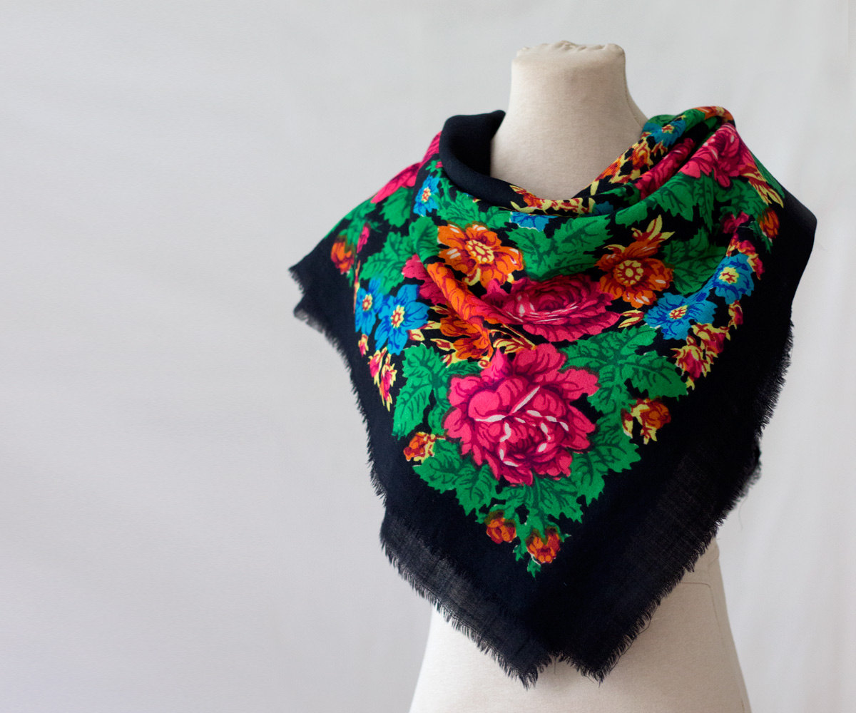 Платок шерстяной 82х82 с цветочным мотивом с розами, украшенным узкой декоративной лентой по кайме