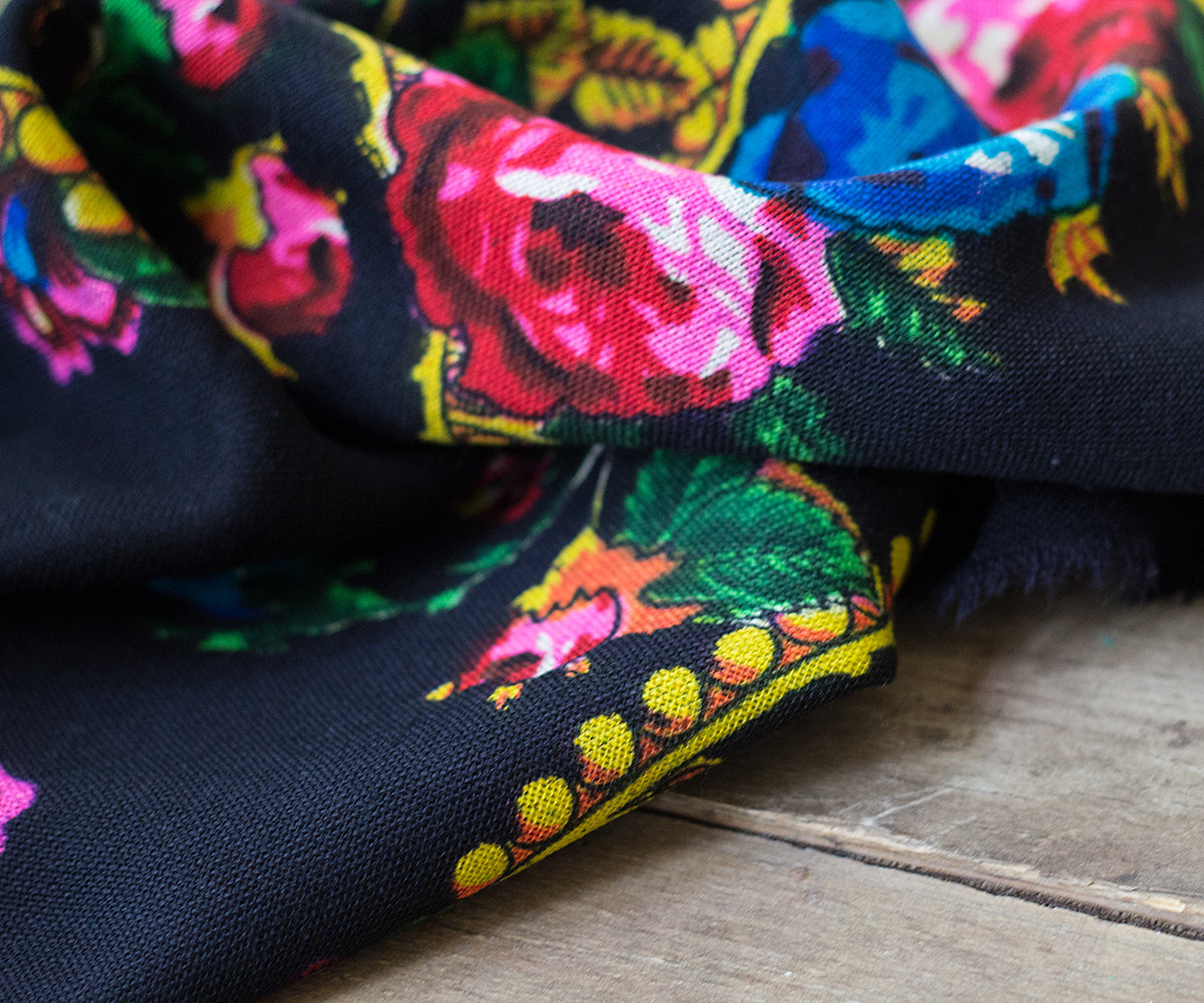 Платок шерстяной 96х96 с розами и гибискусом в пышных букетах