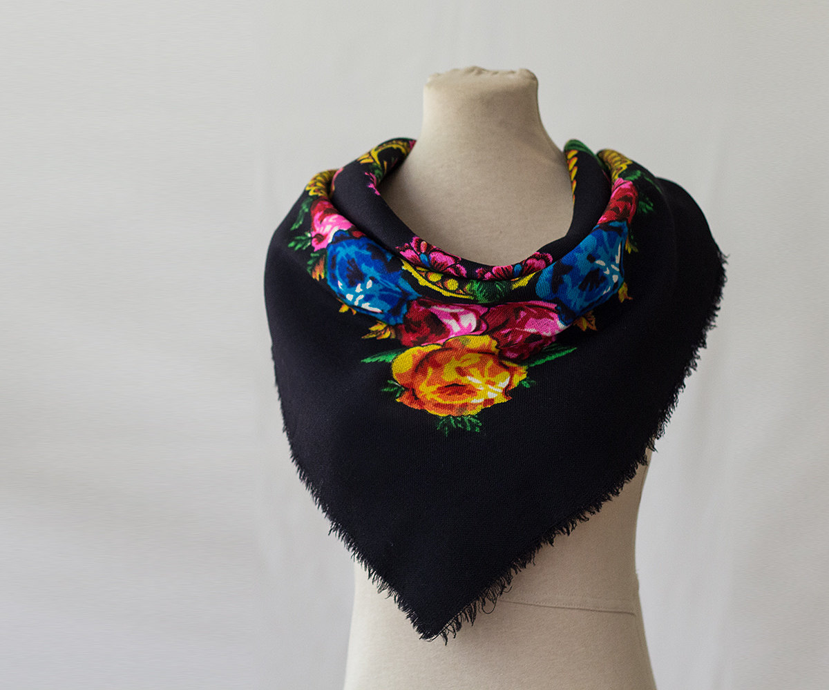 Платок шерстяной 82х82 с цветочным мотивом с розами, украшенным узкой декоративной лентой по кайме