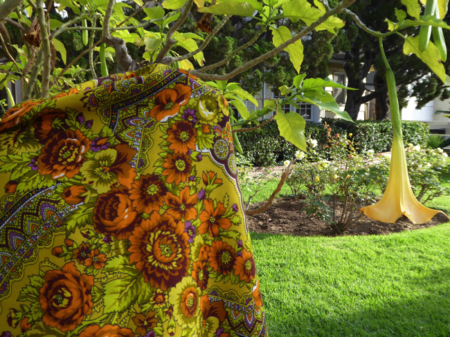 Подкова-7 на сегодняшней прогулке, с Бругмансией (Ангельские Трубы) на соседней улице :""