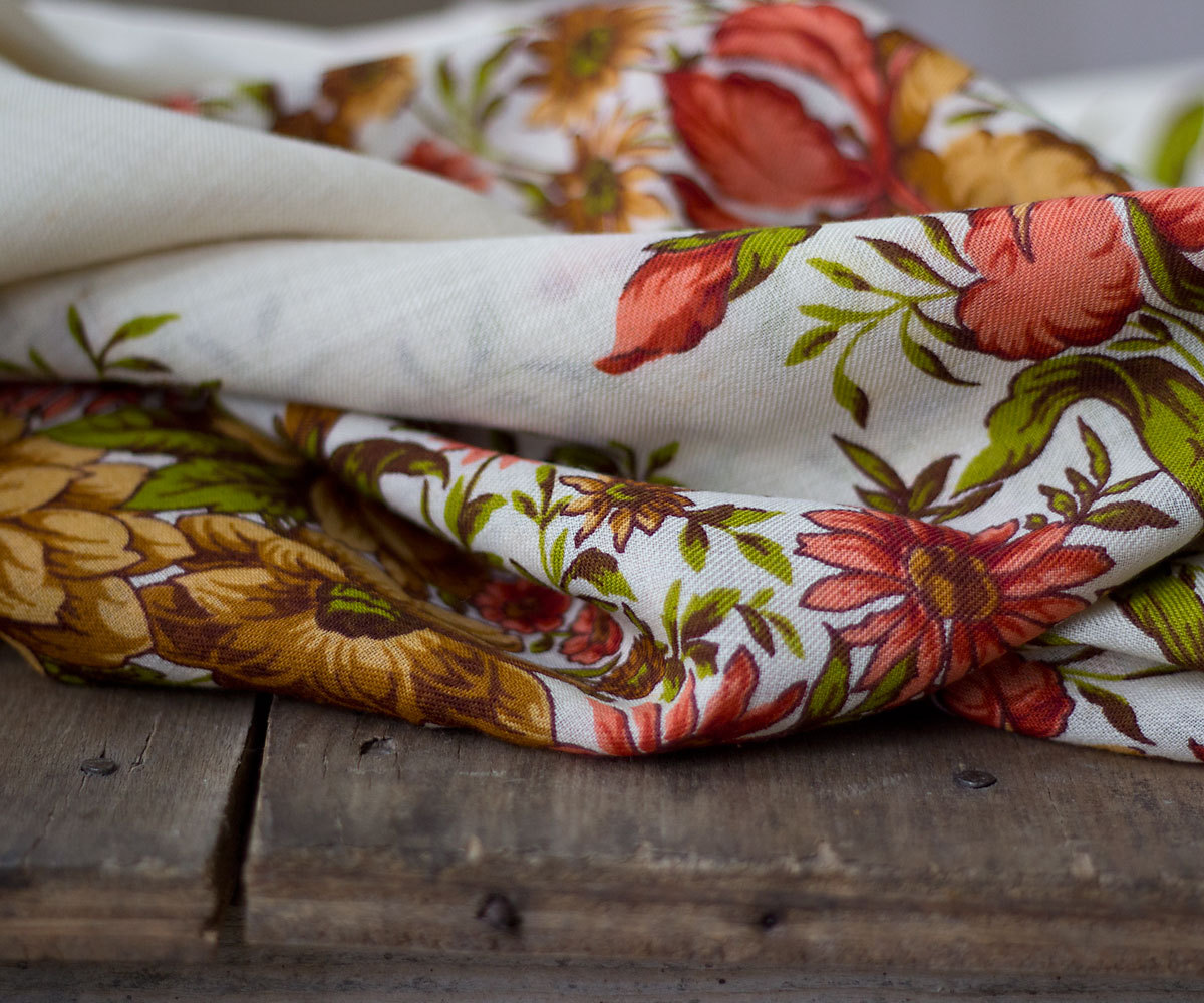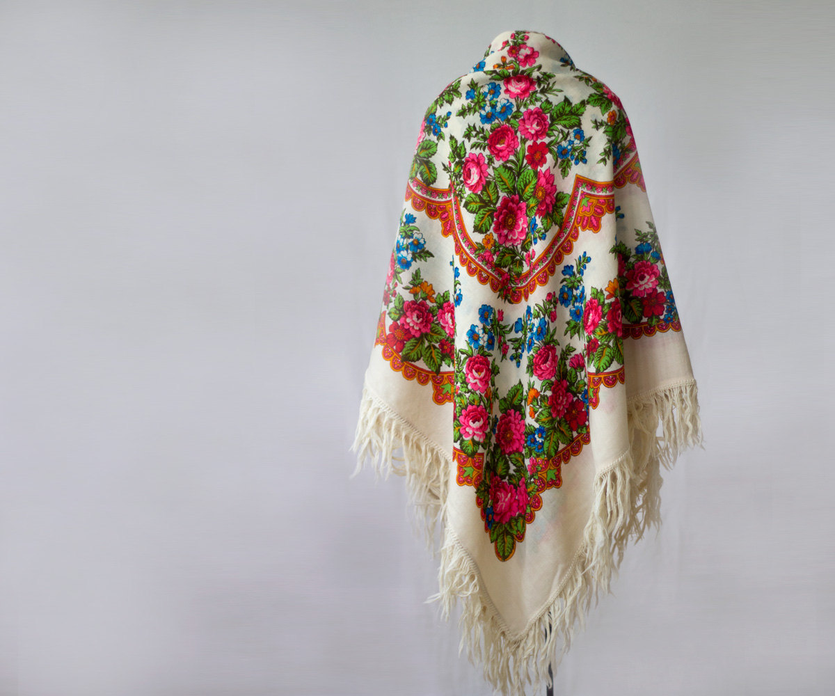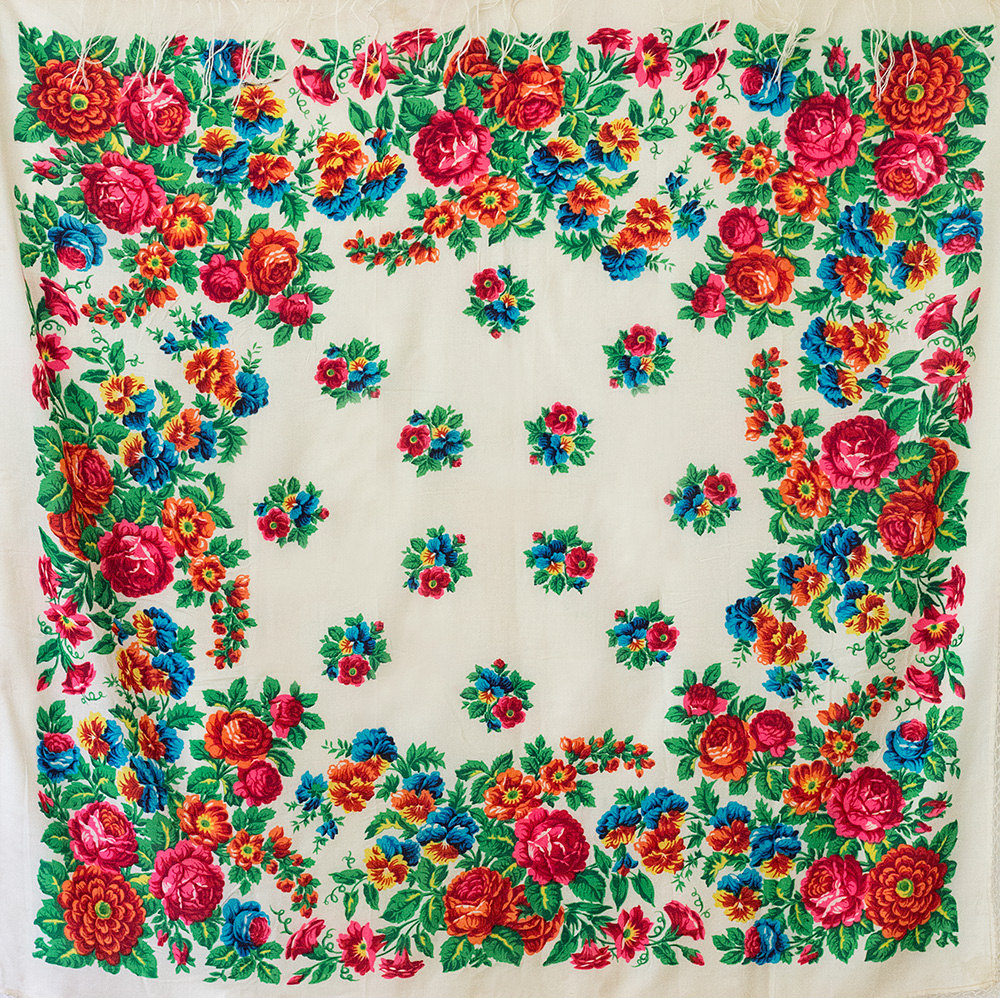Шаль 148х148, с лохматыми георгинами и гирляндами из ирисов