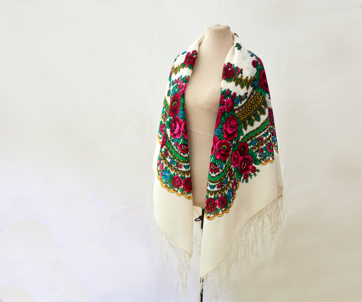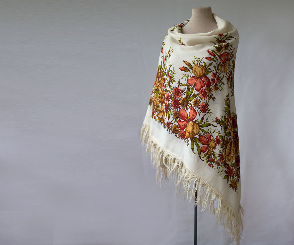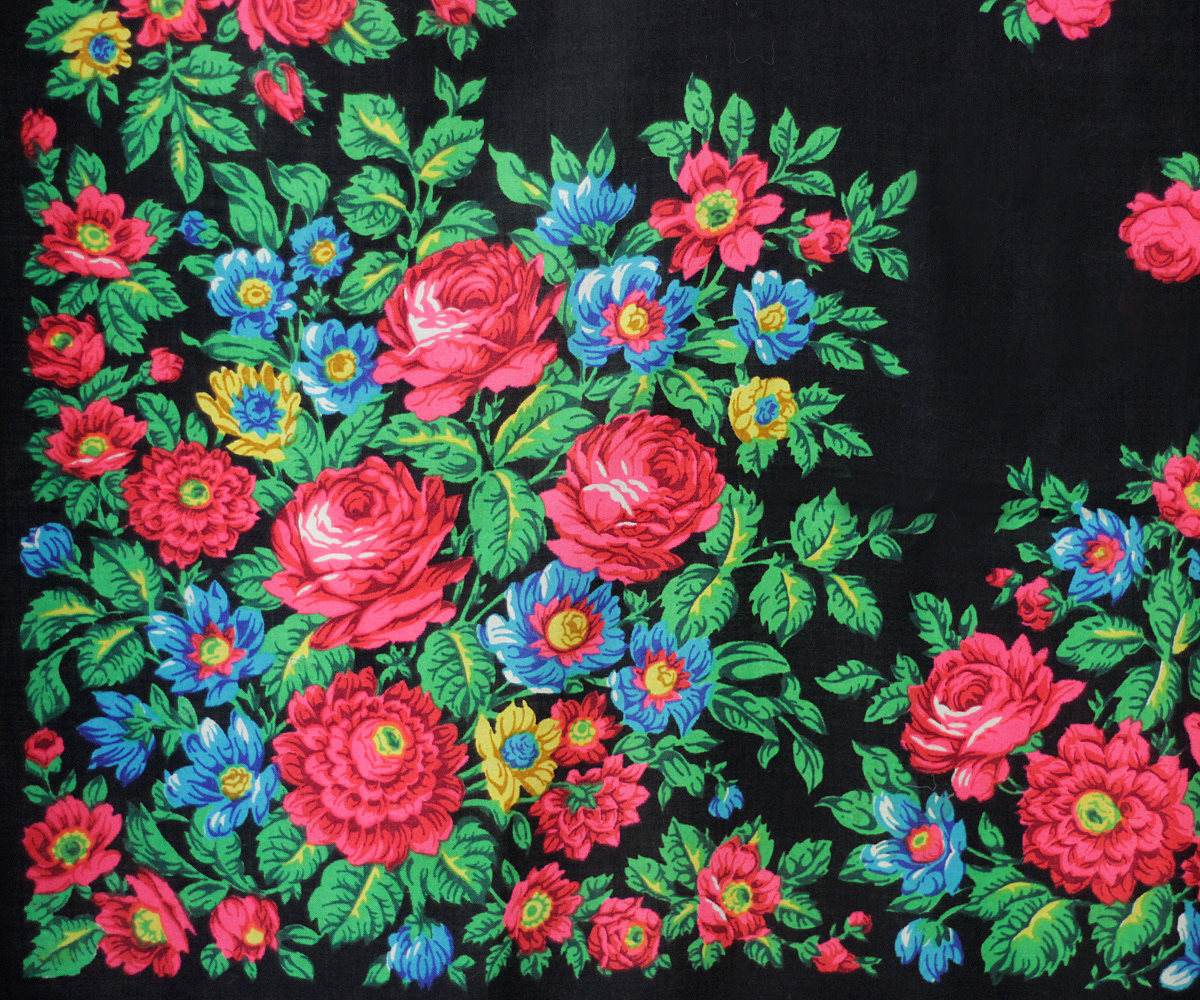 Шаль 148х148, с лохматыми георгинами и гирляндами из ирисов