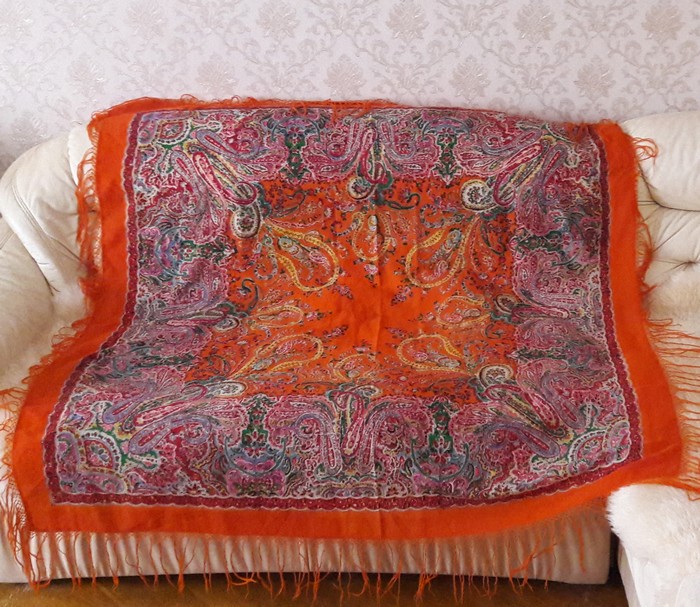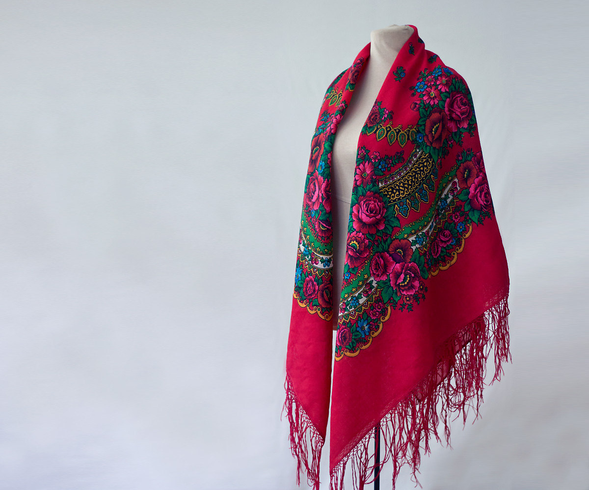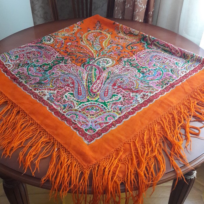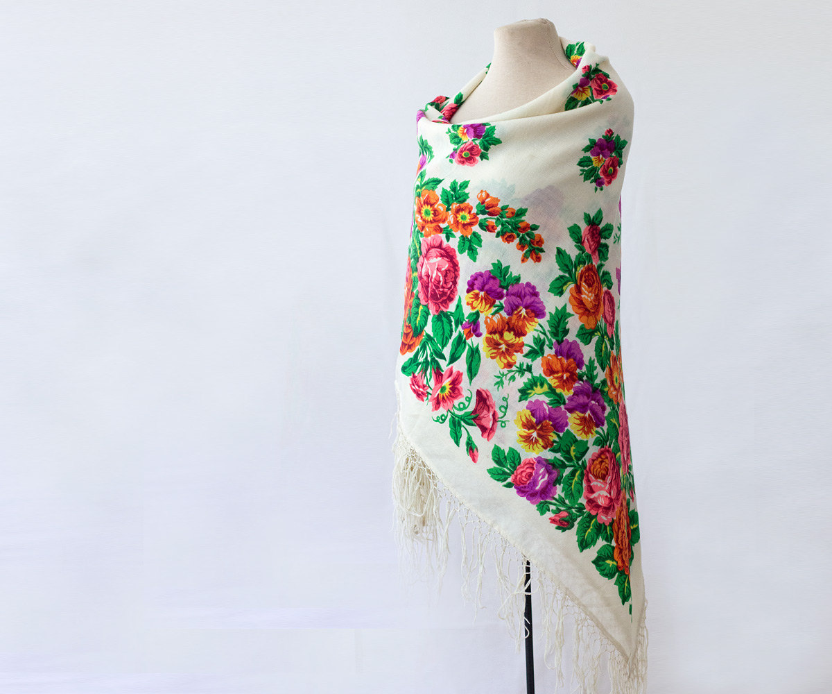 Шаль 148х148, с лохматыми георгинами и гирляндами из ирисов