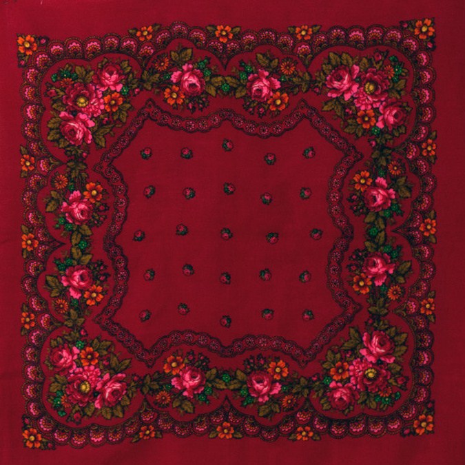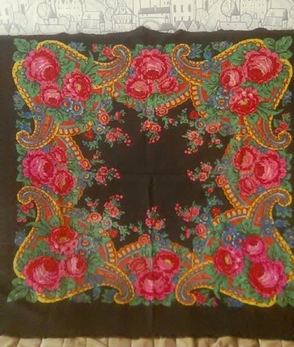 А вот для малинового я сделаю отдельную полочку. На мой беглый взгляд, платочек может быть из Павловского Посада. Сделайте, пожалуйста, фотографии фрагментов. Заметила в орнаменте несвойственный ППМ элемент... Тоже может быть из Баку, как и чернопольный.