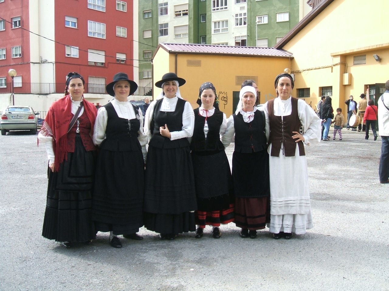 Нашла сайт провинциального галисийского ансамбля "Antaruxas и Sorteiros". Группу эту, входящую в культурную ассоциацию с тем же названием, создали в 1979 году жители Фонсаграды (муниципалитет в провинции Луго с населением чуть больше 4 тыс.) с целью изучения и сохранения истории региона через музыку и танец. Используют костюмы и инструменты, характерные для региона, участвуют во множестве фестивалей и конкурсов в Испании и за рубежом. Из фотоотчетов с мероприятий видно, что в 2009 году костюмы были совсем другие, преобладал черный цвет, цветастых шалей не было и в помине (фото 1, 2).
