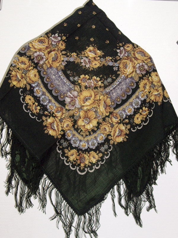 Особенно мне понравилось как выглядит рисунок на платке, сложеном пополам. Если закрепить его спереди красивой булавкой, то получается красивая накидка на плечи. А вот для повязывания на голову такой рисунок вряд ли подойдет, несмотря на размер платка.