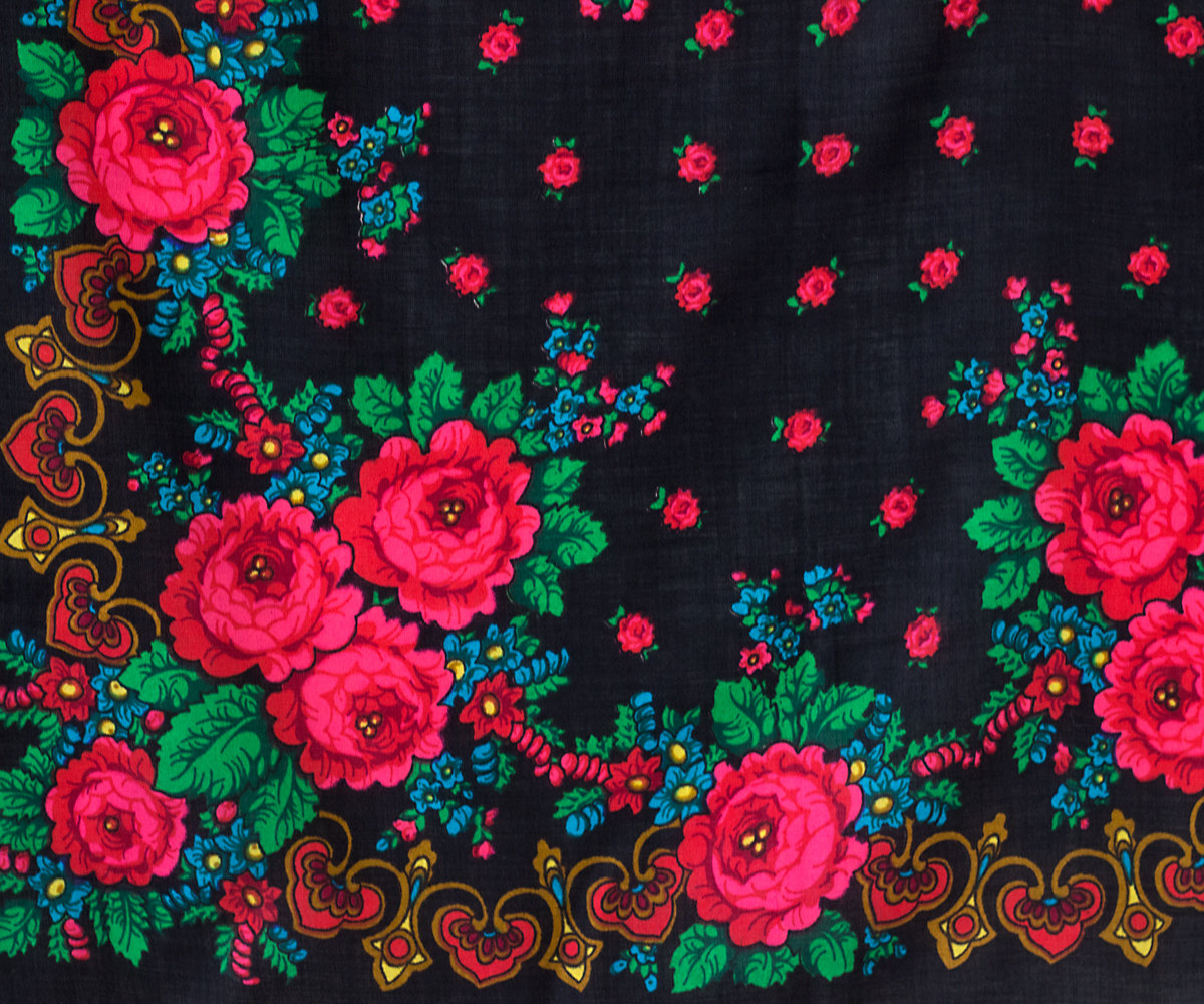 Платок шерстяной 96х96 с букетами роз, бусами и резным цветным орнаментом