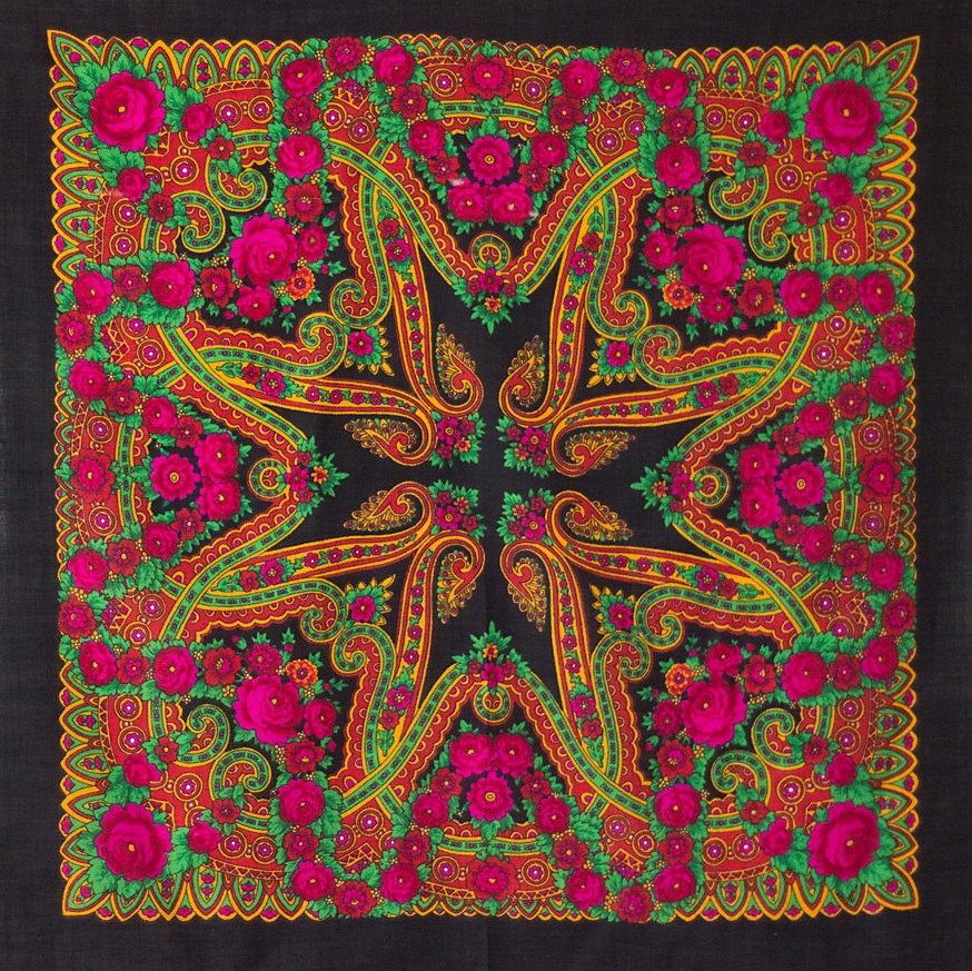 Платок шерстяной 95х95 с цветочно-орнаментальной композицией с фестонами по краю орнамента. 1980-е гг.