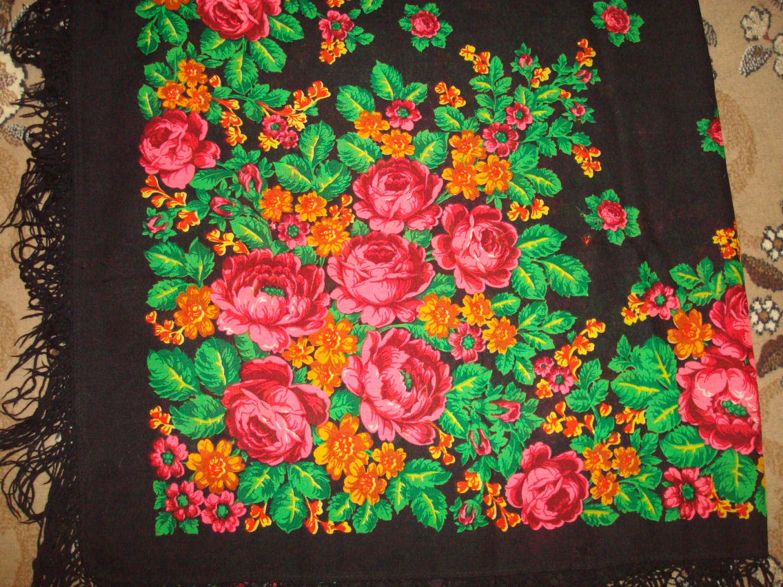 Здравствуйте! Прошу о помощи! Попал мне в руки платочек, нашла я его, путешествуя, на стене деревенского Дома Культуры(было украшено к празднику). Выпросила-вымолила, отдали его мне. Он 146х146 см., примерно конца 80-х, начала 90-х годов,ткань очень тонкая.И этикетки, конечно , не сохранилось. Бахрома похожа на х/б. Помогите опознать! Очень хочется узнать, кто автор этой красоты. Видела на форуме фото такого платочка, тоже владелица пыталась опознать, у нее ,вместо золотистых, мелкие цветочки были синие. Помогите!