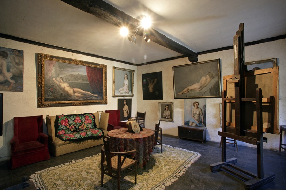 Это салон обнаженной натуры, может, потому и шаль на диване – как символ привычной одежды, которой нет на тех, кто взирает со стен? Как ассоциация – вот модель скинула с себя обычный наряд и осталась как есть. Или наоборот, накинула после сеанса традиционный испанский атрибут.