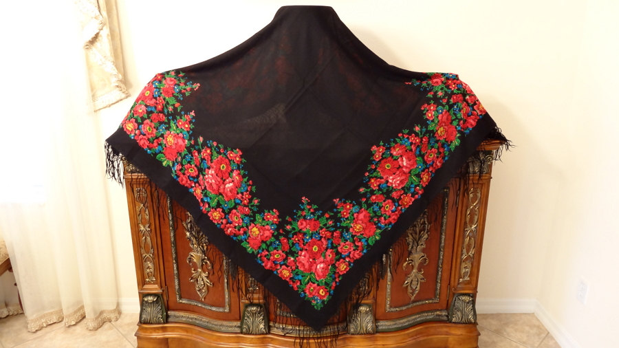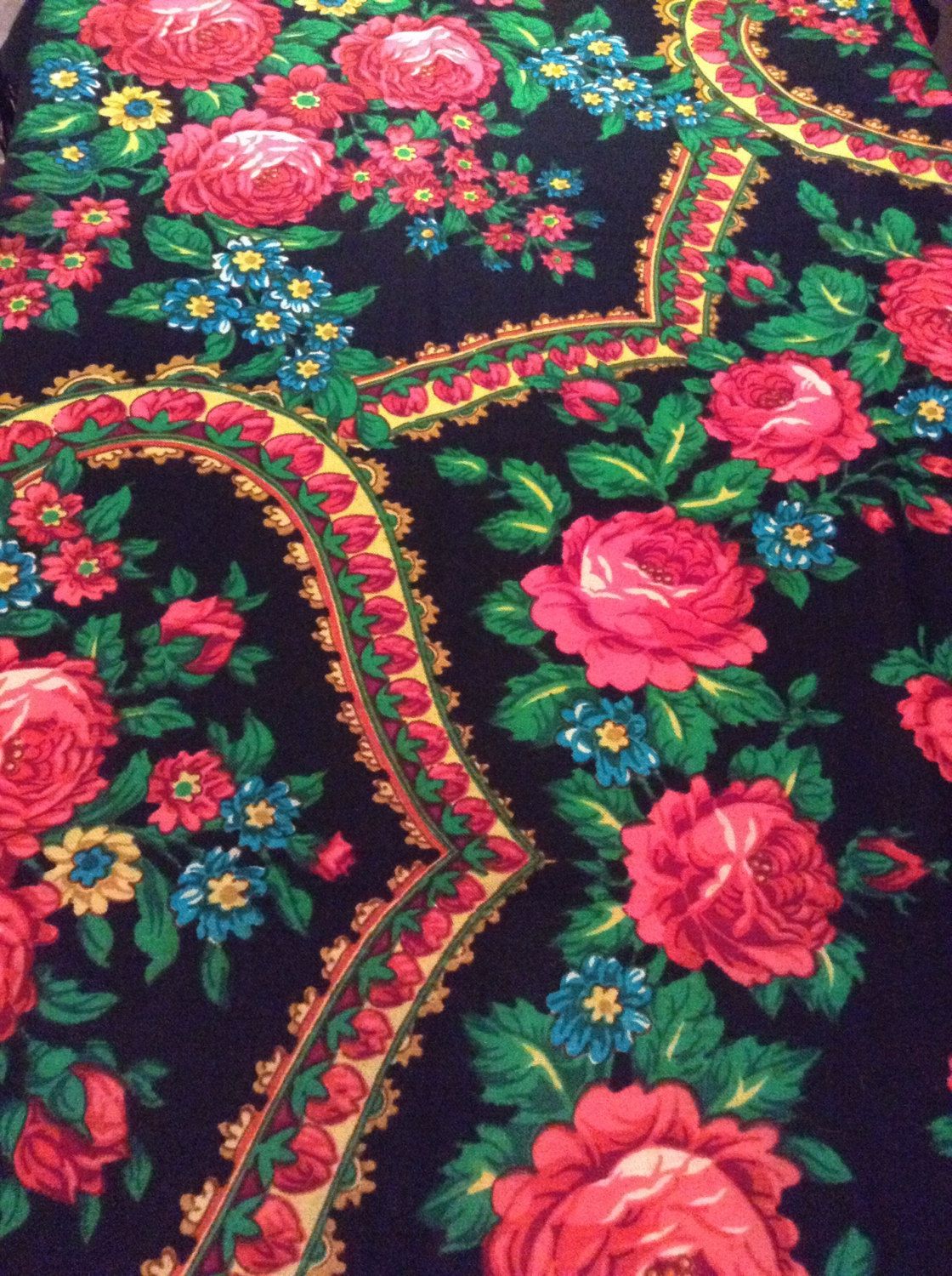 Этикетка отсутствует, увы. Да и средник "ситцевый", т. е нет привычного для украинских платочков "хоровода" штампочек, часто двух разных цветов. Думала-думала... Всё-таки павловопосадский платок