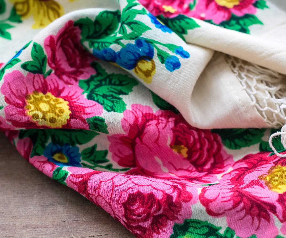 В 70-х гг. мало, кто носил большие шали, вот она и разрезала его на 4 части и раздарила на память племянницам и внучкам. Этикеток не сохранилось. Знаю только, что платок был куплен в Москве. ППБ_29