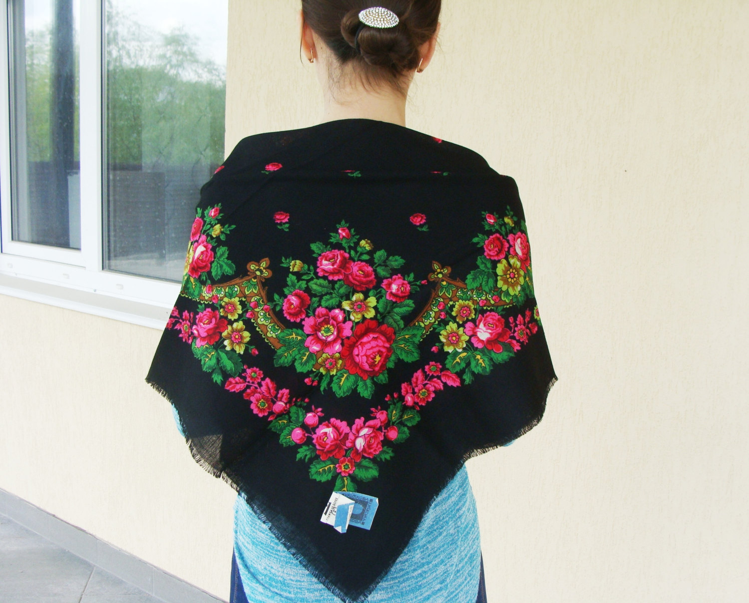 Это мне в личном сообщении написала продавец, так как, я попросила сделать отдельно фото этикетки. Но, продавец сообщила, что с такого рода техникой мало дружит. Смогут сделать на следующих выходных кто то из детей или внуков . Ну я и попросила написать, что на этикетке..... Очень этому рада, поскольку имею такой платок, непонятно то ли черный то ли темно синий, это под каким углом смотреть.