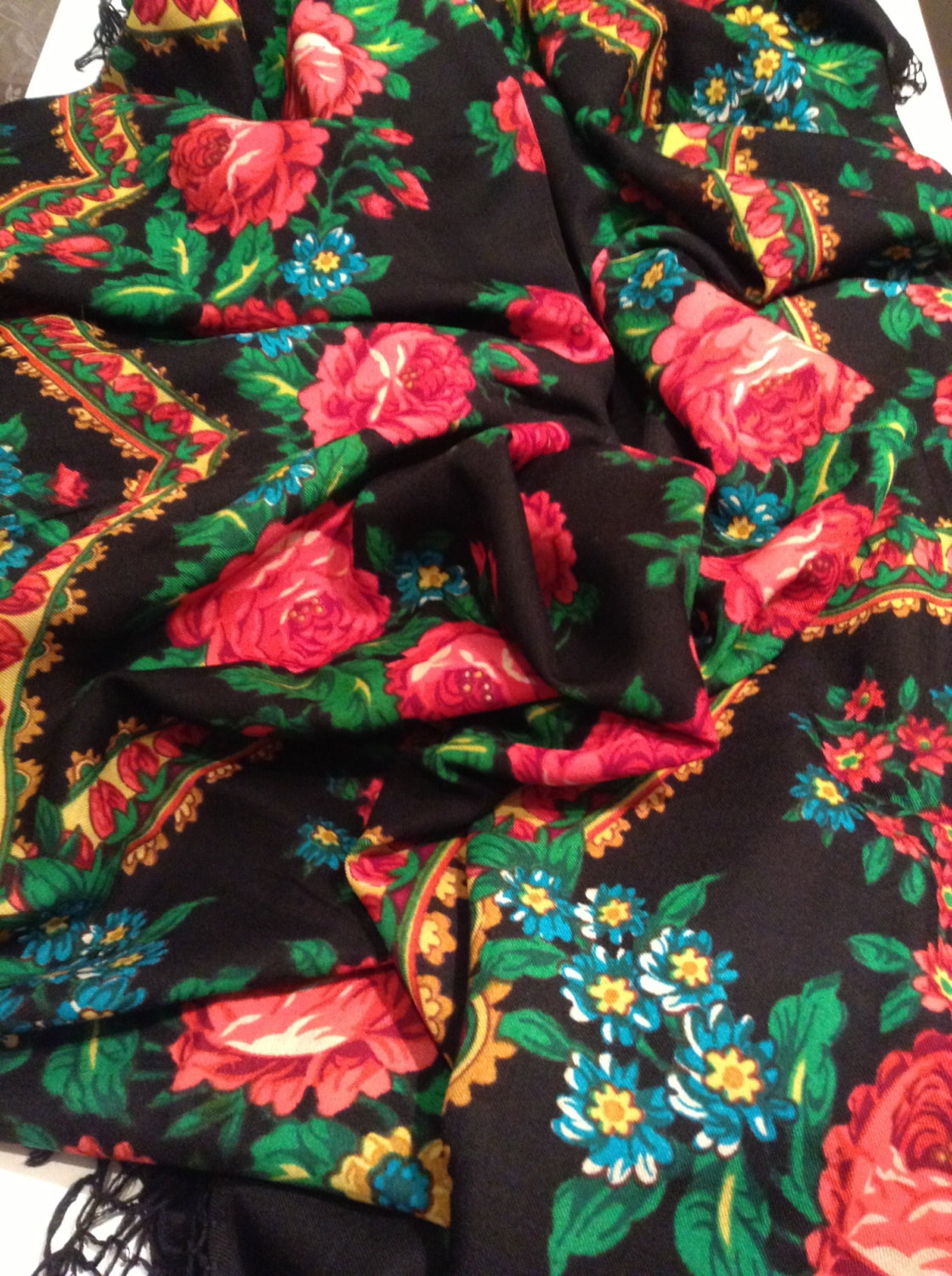 Дорогая eleka! Это павловопосадский платочек - у меня точно такой же!!! Один в один, разве что у Вашего цветочки поярче, но я свой ношу уже лет 20... А где-то год назад увидела в продаже такой же и с этикеткой (надо было купить, наверно?) - сохранила фото этикетки. Вот она: