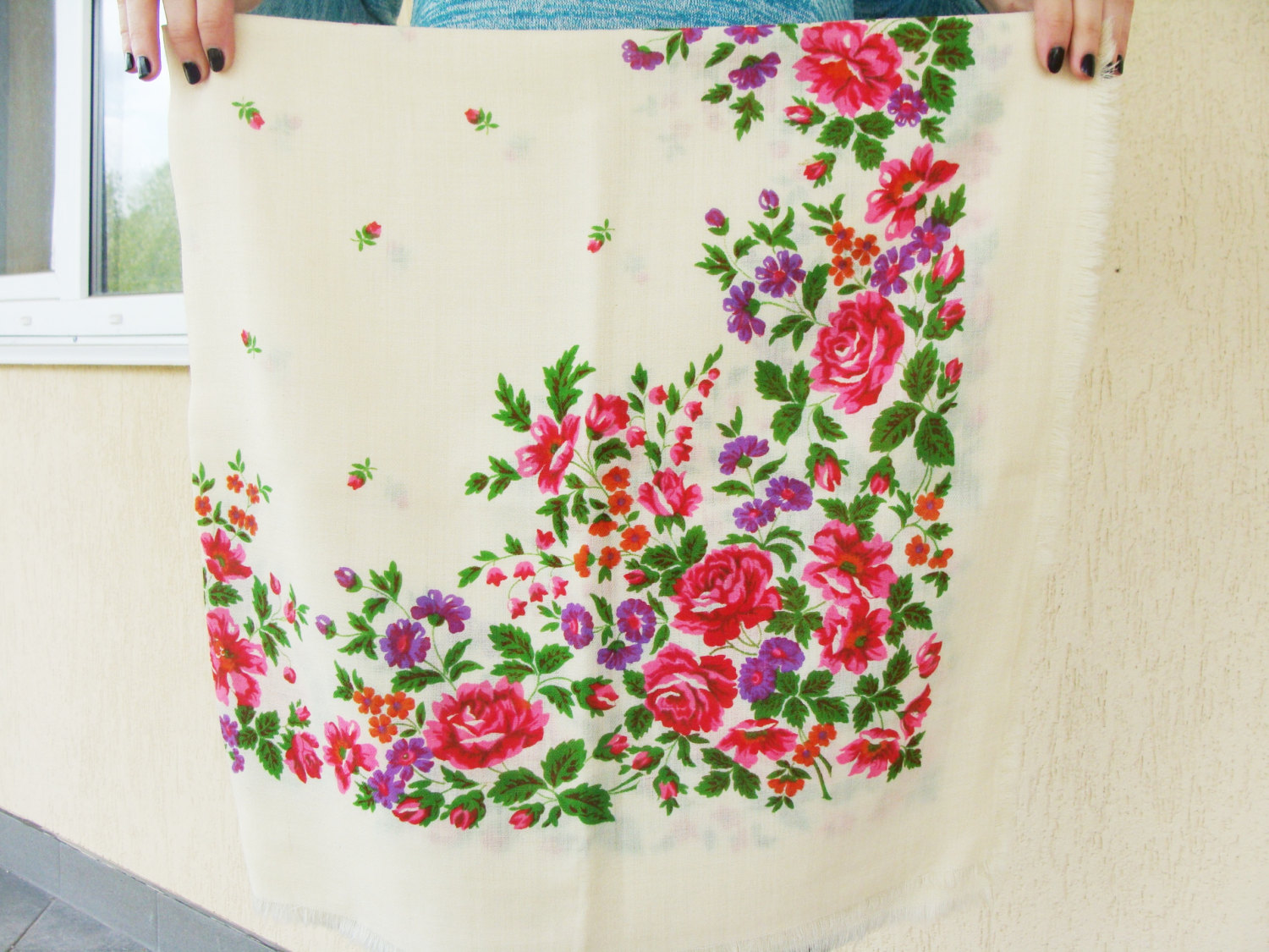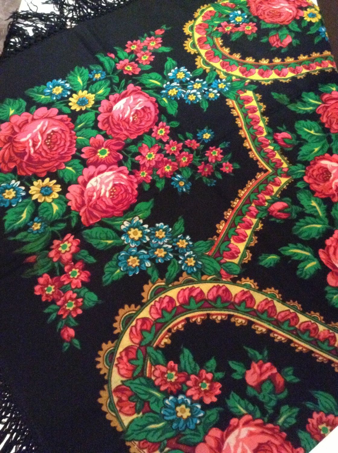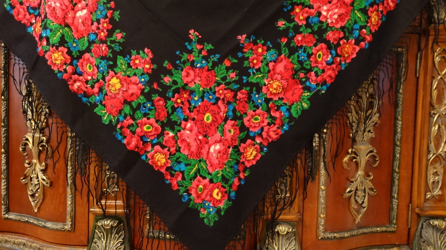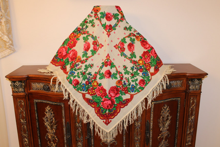 Этикетка отсутствует, увы. Да и средник "ситцевый", т. е нет привычного для украинских платочков "хоровода" штампочек, часто двух разных цветов. Думала-думала... Всё-таки павловопосадский платок