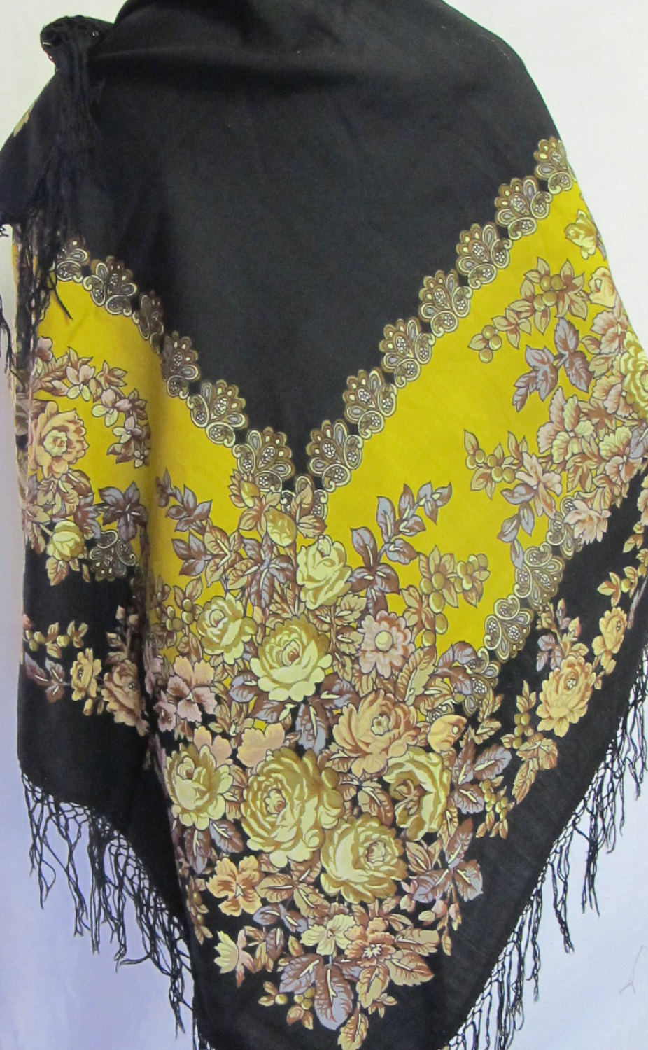 Этикетка отсутствует, увы. Да и средник "ситцевый", т. е нет привычного для украинских платочков "хоровода" штампочек, часто двух разных цветов. Думала-думала... Всё-таки павловопосадский платок
