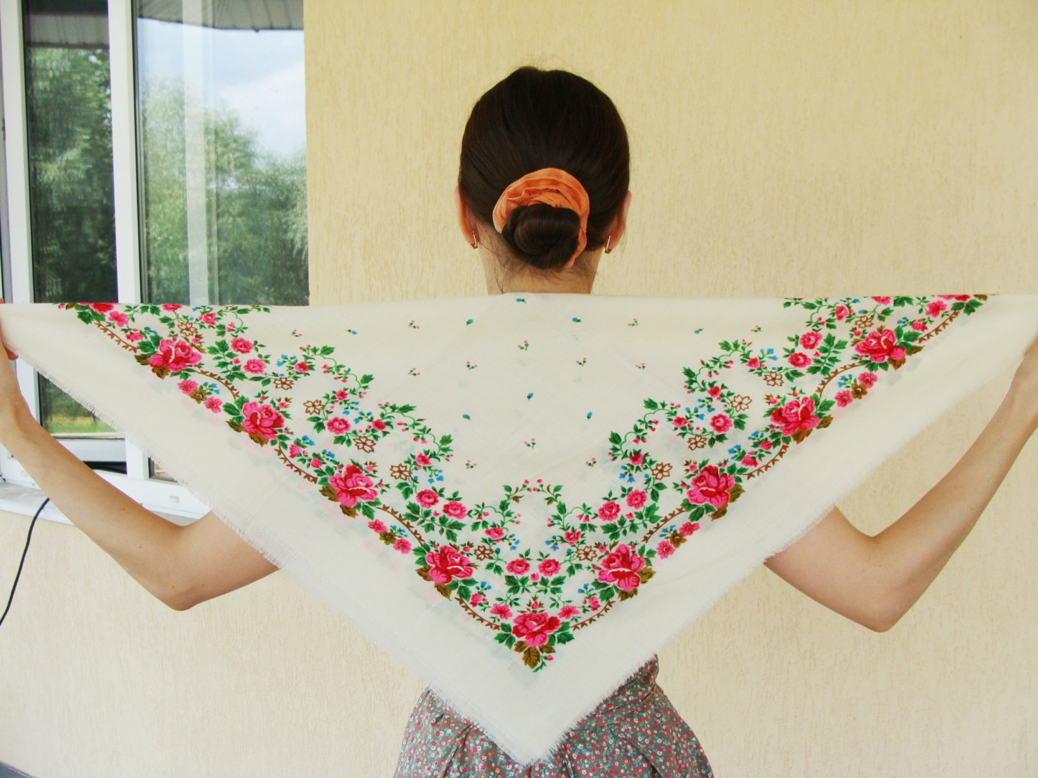 Другой платок аналогичного колорита с этикеткой киевской фабрики ТРОЯНДА